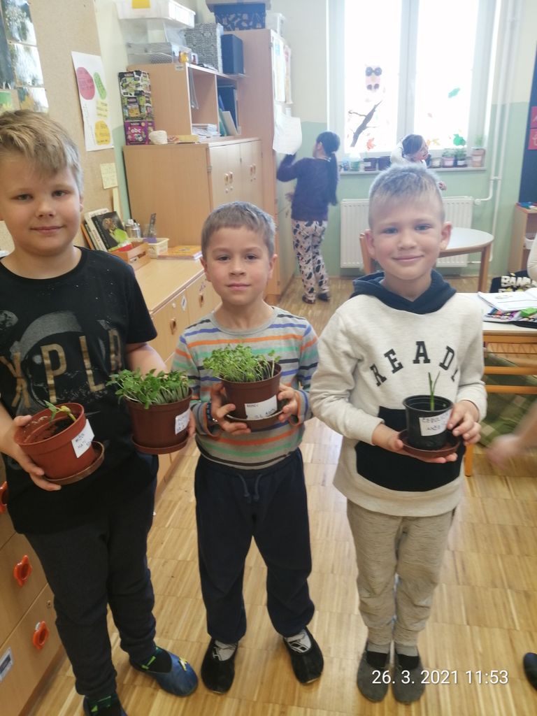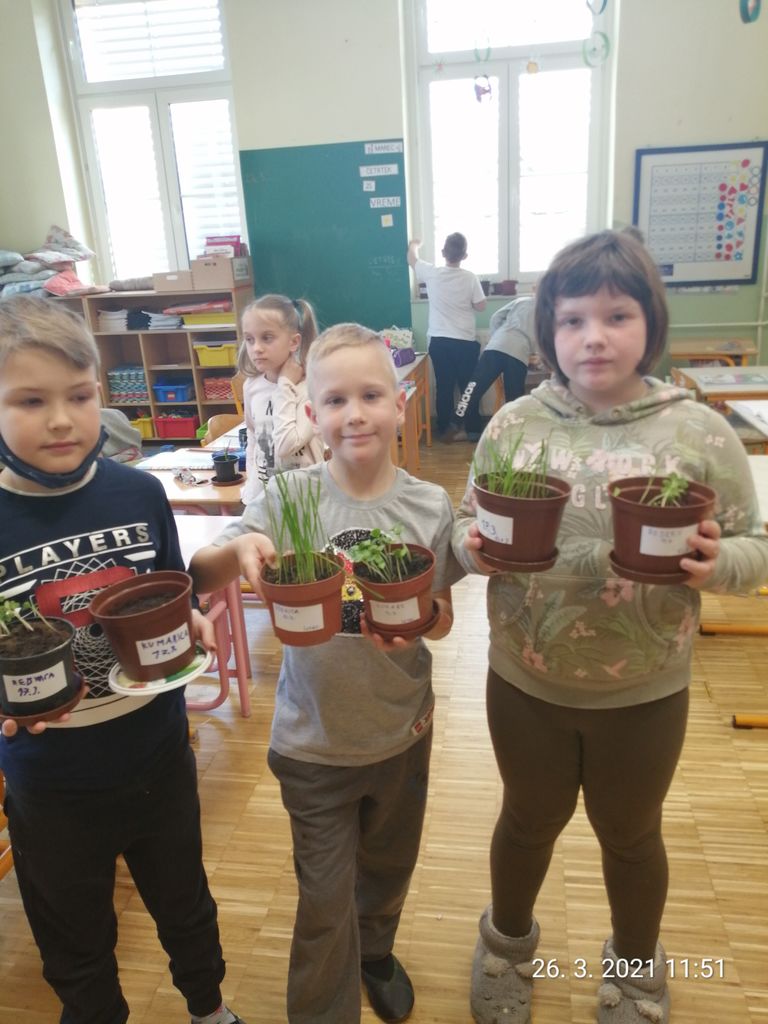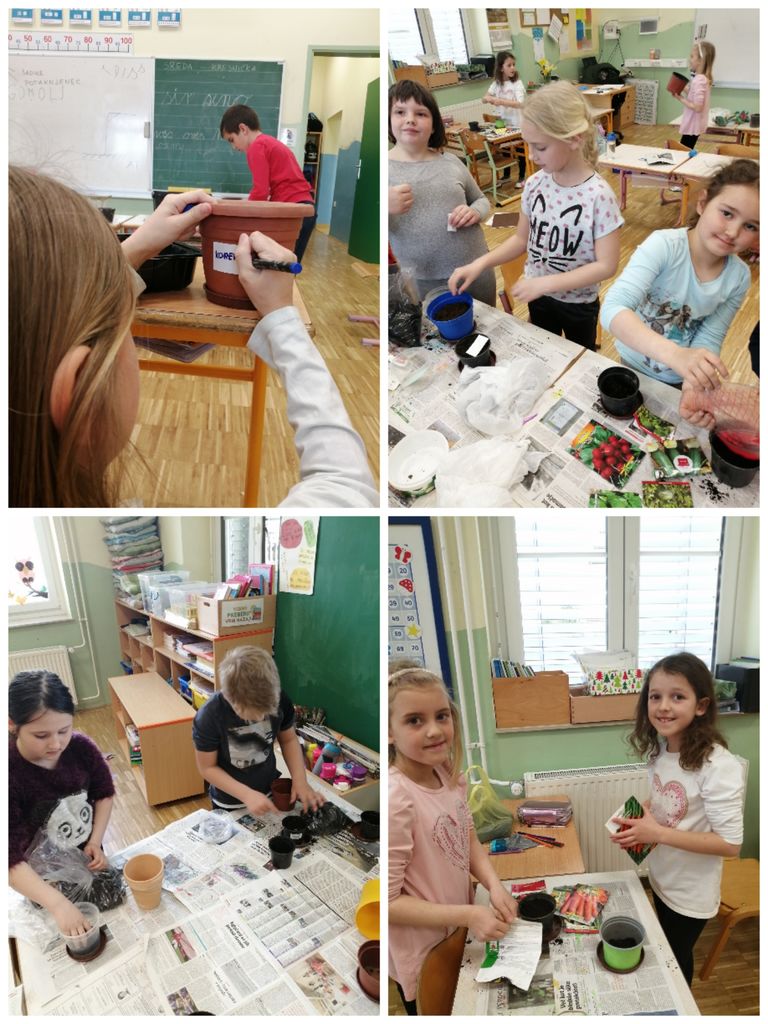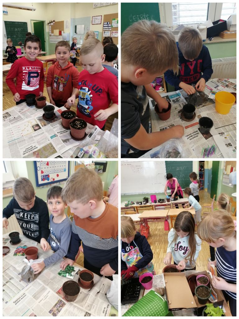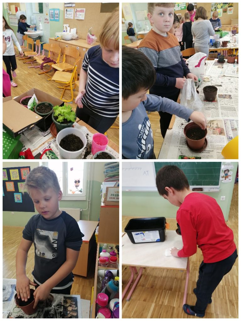 17. marca smo učenci v šolo prinesli semena, sadike, lončke s podstavki in zemljo. Najprej smo povedali, kaj je kdo prinesel. Nato smo mizice pokrili s časopisnim papirjem. Vsak je posejal ali posadil, kar je imel. Na lončke smo zapisali datum in ime rastline. Posevke smo rahlo zalili in jih postavili na okensko polico.