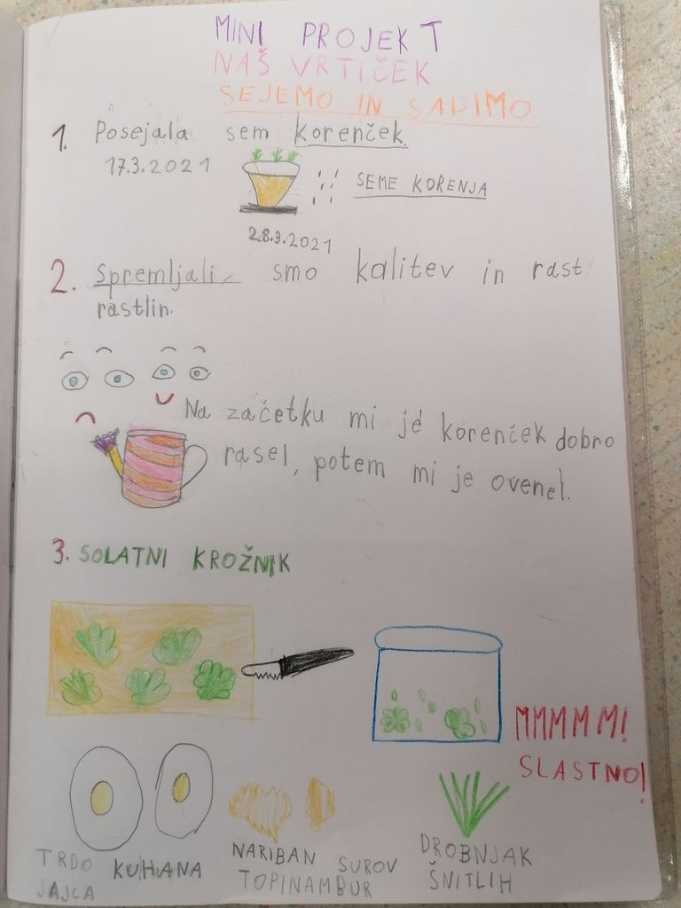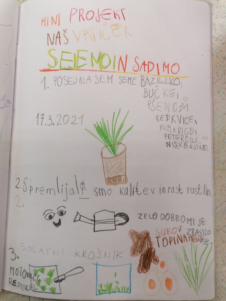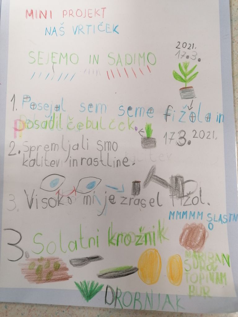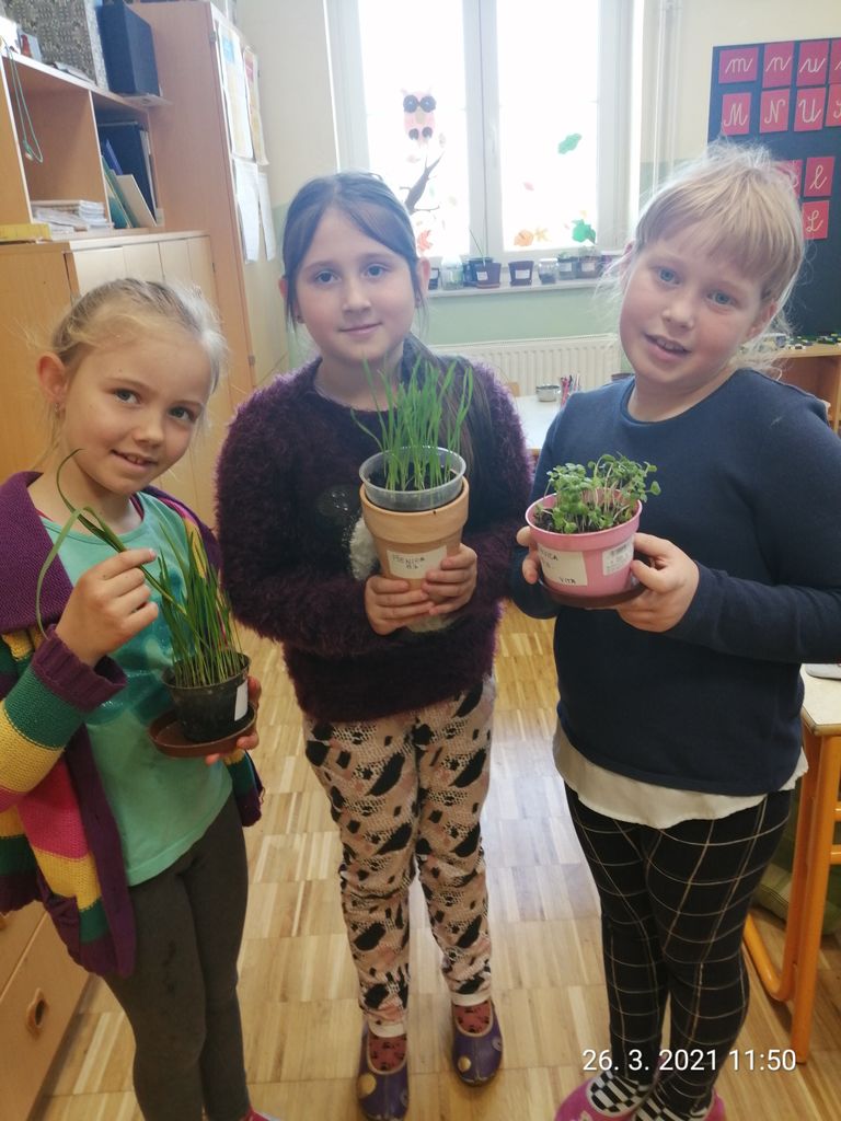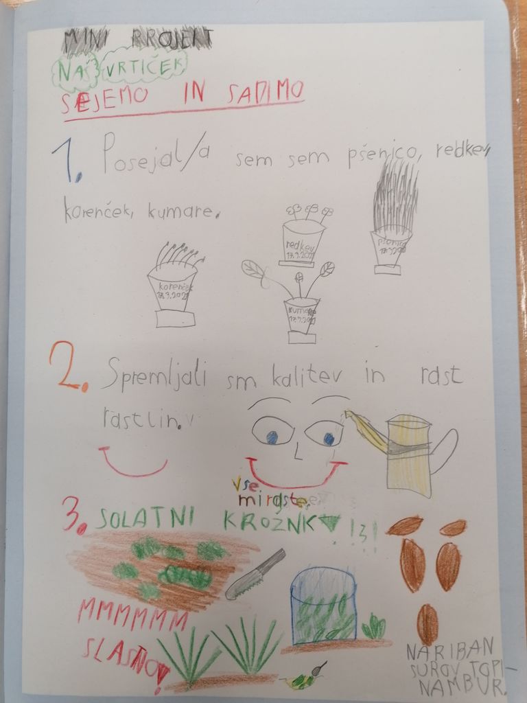 Vzklile so nam kumare, korenček, sončnice, redkev, solata, bučke, fižol, bob, bazilika, timijan, čebula in pšenica. Posadili smo sadike zimske in letne solate in pora ter gomolje topinamburja in krompirja. Vsak dan smo si ogledovali rastline in jih po potrebi zalivali. Ko so nam zelo zrastle, smo jih odnesli domov. Presadili smo jih na vrt ali v rastlinjak. Upamo, da bomo čez kake tri mesece imeli tudi kaj našega pridelka za v usta. Za to smo se tudi trudili.