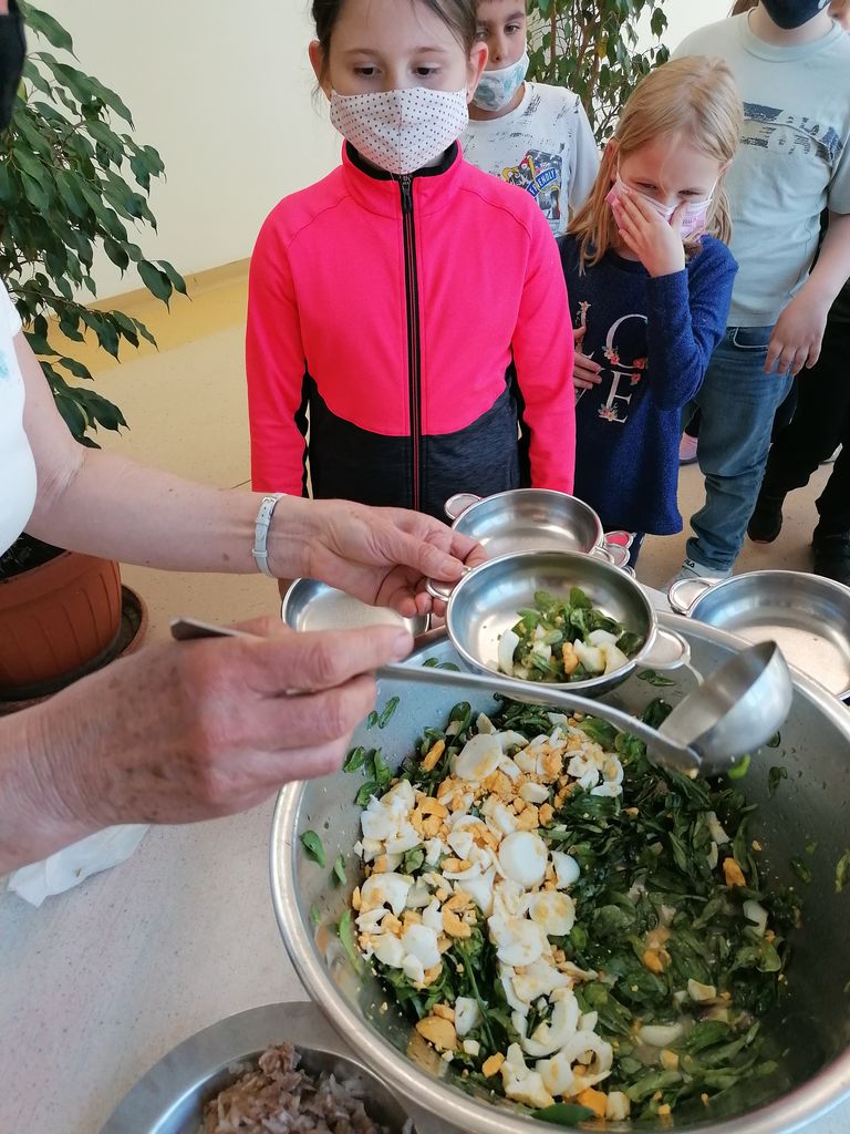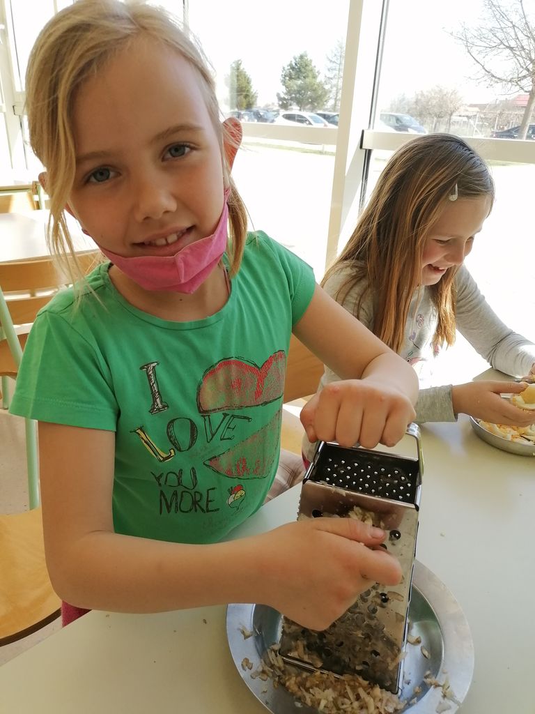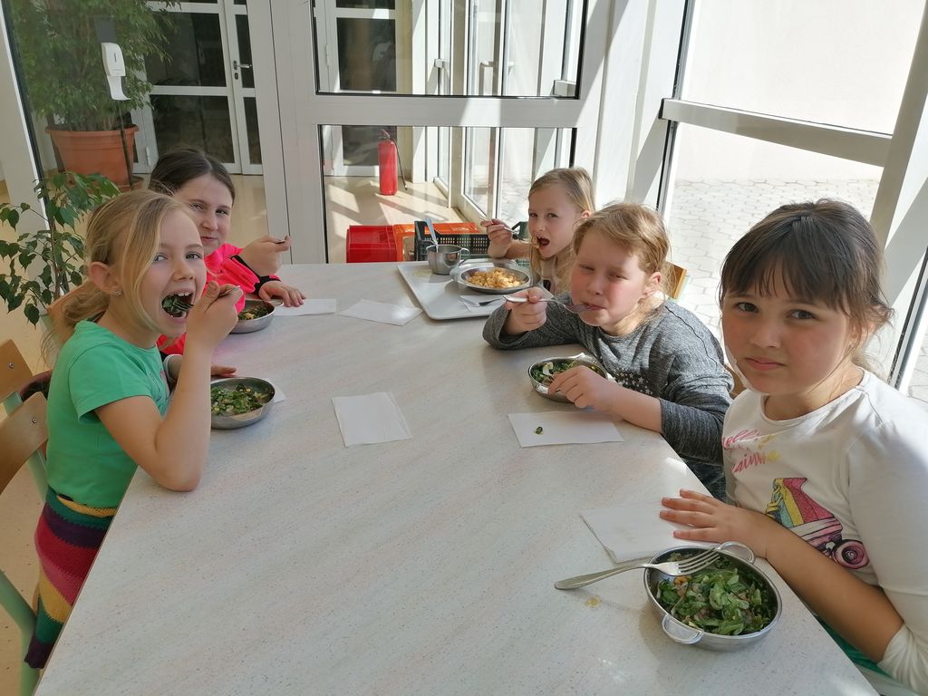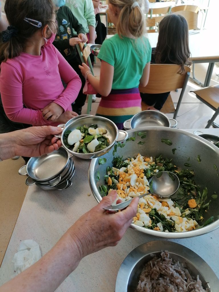 31. marca smo šli na šolski vrt po solato. Nabrali in očistili smo motovilec in regrat, ki je tudi kar rastel na vrtu. Naredili smo si solatni krožnik. Kuharice so nam za dodatek skuhale jajca, sami pa smo naribali še surov topinambur in narezali drobnjak. Tudi jajca smo sami olupili in narezali. Vsak je dobil svoj slasten solatni krožnik. Mi trije smo vse pojedli. Solata je bila odlična, še posebej, ker smo jo sami pripravili. Pa še zdrava in domača je, kar pa je najbolj pomembno.