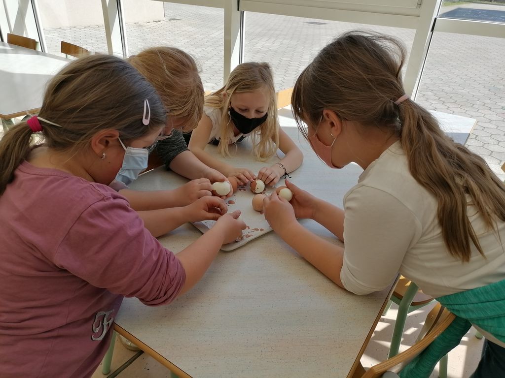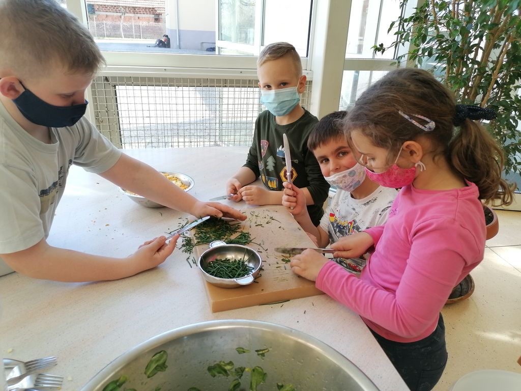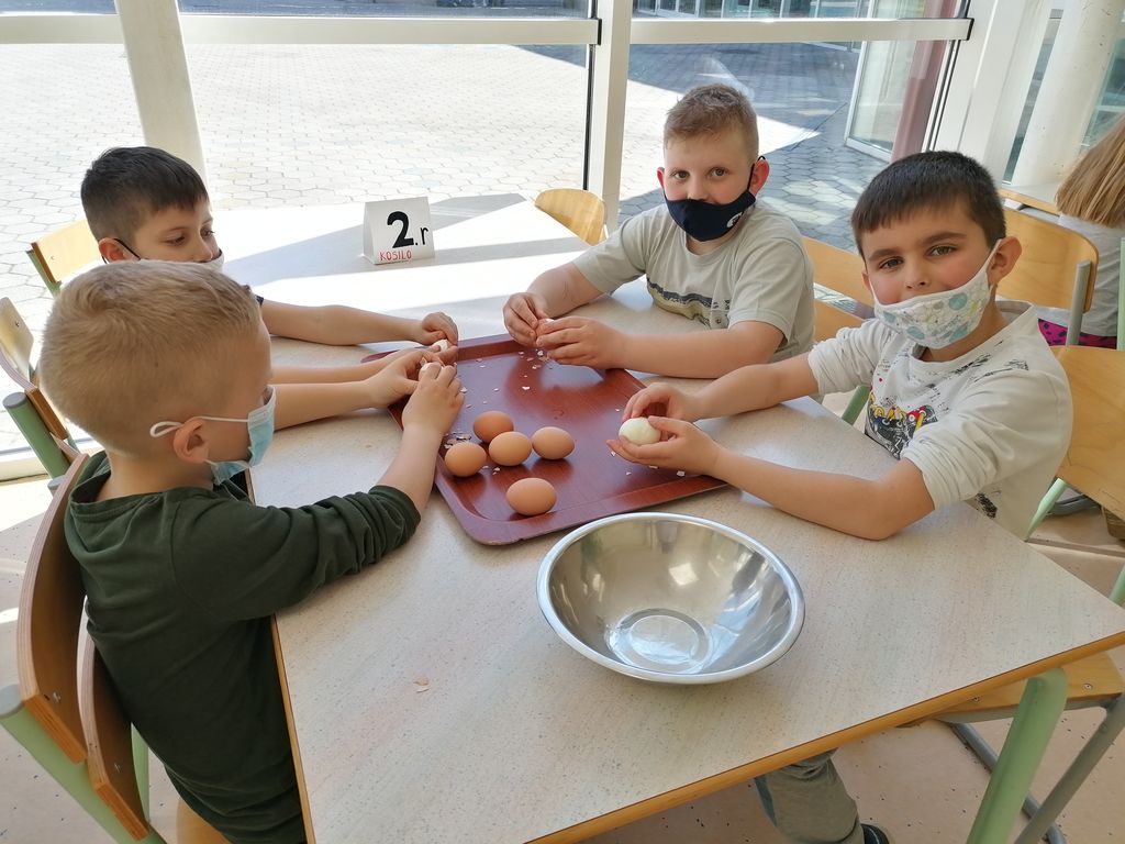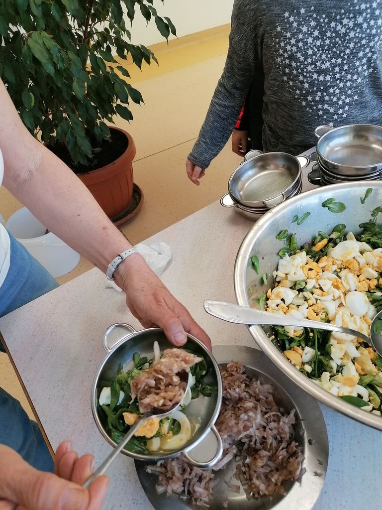31. marca smo šli na šolski vrt po solato. Nabrali in očistili smo motovilec in regrat, ki je tudi kar rastel na vrtu. Naredili smo si solatni krožnik. Kuharice so nam za dodatek skuhale jajca, sami pa smo naribali še surov topinambur in narezali drobnjak. Tudi jajca smo sami olupili in narezali. Vsak je dobil svoj slasten solatni krožnik. Mi trije smo vse pojedli. Solata je bila odlična, še posebej, ker smo jo sami pripravili. Pa še zdrava in domača je, kar pa je najbolj pomembno.