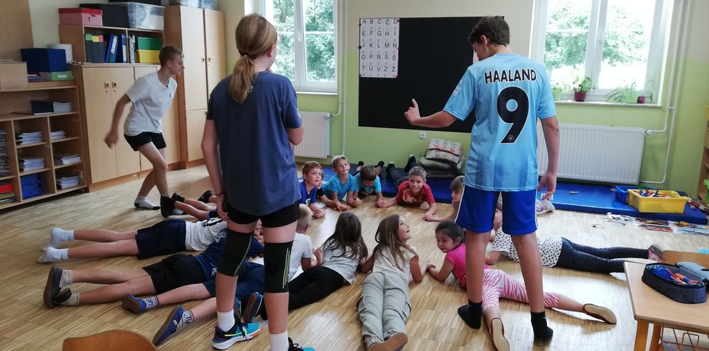 V podaljšanem bivanju smo ga izkoristili za socialne in športne igre, sejanje špinače, postavljanje okvirjev za pajkove mreže, nabiranje želodov, gradnjo v peskovniku, poslušanje glasbe v naravi, ples med igrali, aktivno druženje s starejšimi učenci – tutorji, ki so učencem pokazali zanimive igre. Tretješolci so spoznali angleško namizno igro.