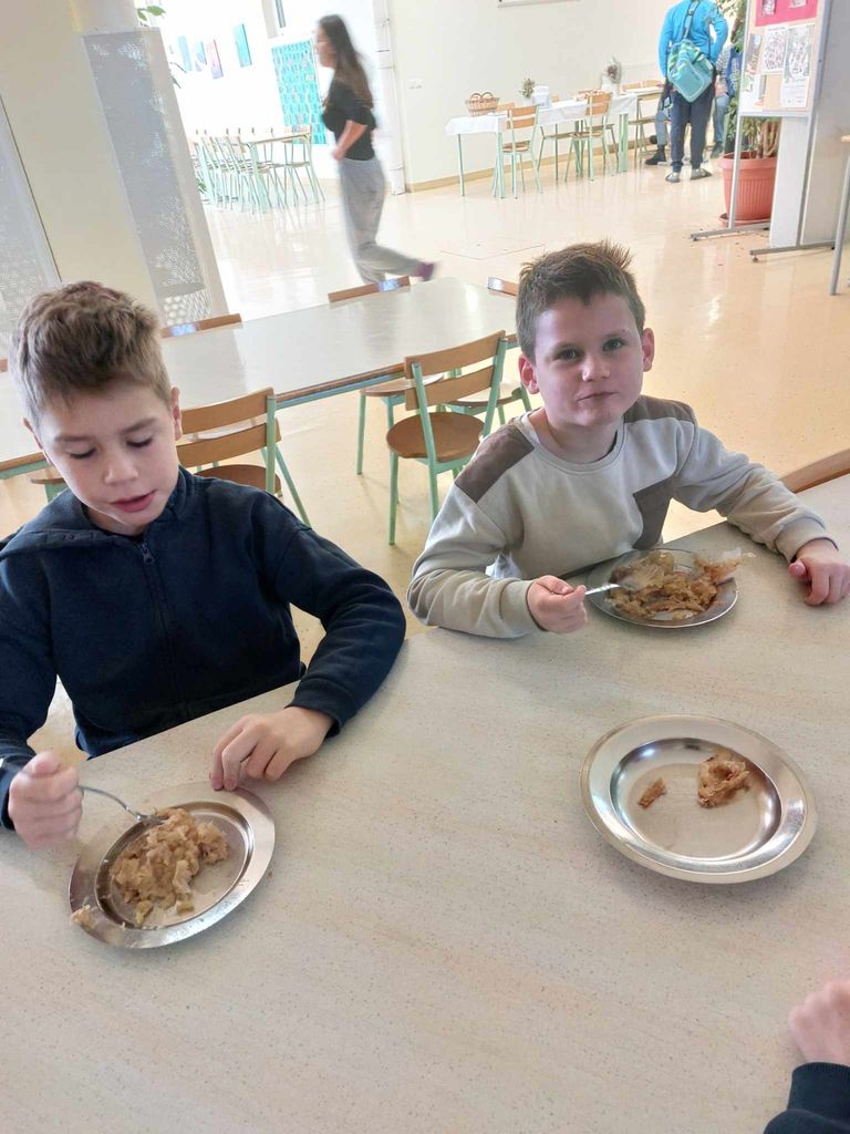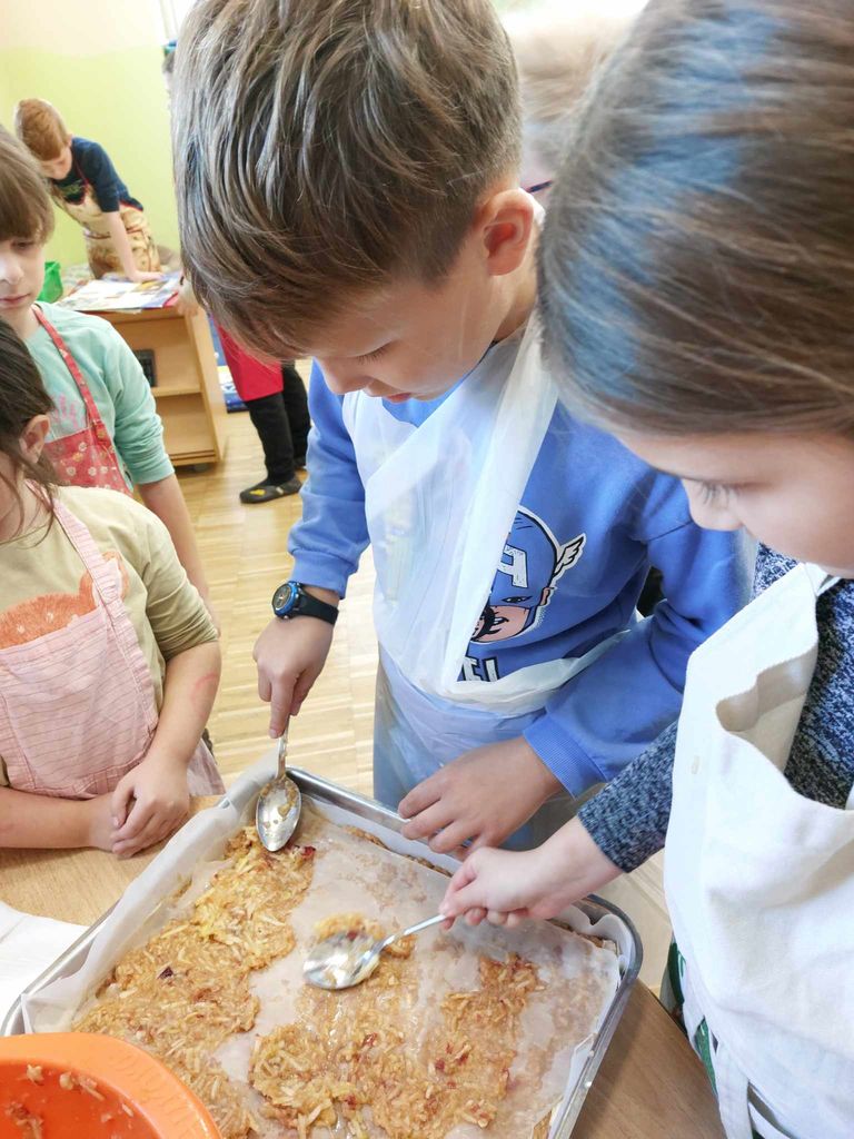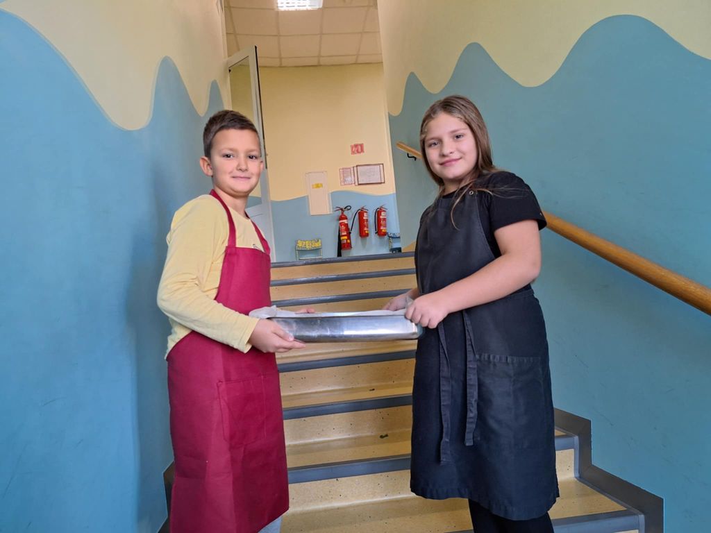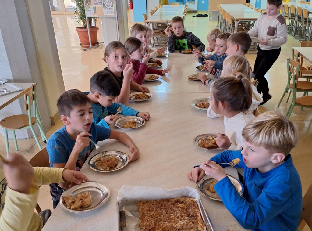 Že pri načrtovanju jedilnika smo bili pozorni na teden, namenjen slovenskim jedem. V timu za prehrano smo ugotovili, da imamo zares veliko jedi, ki so jih pripravljali naši predniki in jih z veseljem pripravljamo še danes. Poleg domačega kruha, ki so ga spekle tudi naše kuharice, in smo ga otrokom v vrtcu in učencem ponujali ves teden, smo poskusili zaseko, orehovo potico, mleko in polento, ki so jo nekateri obogatili z domačimi ocvirki. Za martinovo kosilo smo ponudili govejo juho z rezanci, mlince od lokalnega dobavitelja, pečenega piščanca ter rdeče zelje v solati. V naslednjih dneh smo poskusili bujto repo, skutine štruklje z drobtinicami, kranjsko klobaso z dušenim kislim zeljem, svinjsko pečenko in pražen krompir ter tradicionalno štajersko kislo juho in gibanico. Teden smo zaključili s Tradicionalnim slovenskim zajtrkom, ki ga obeležujemo že vrsto let.