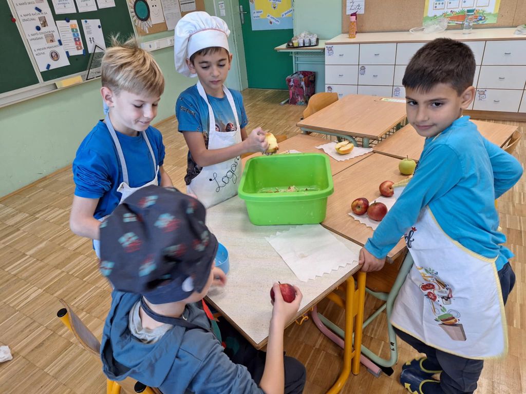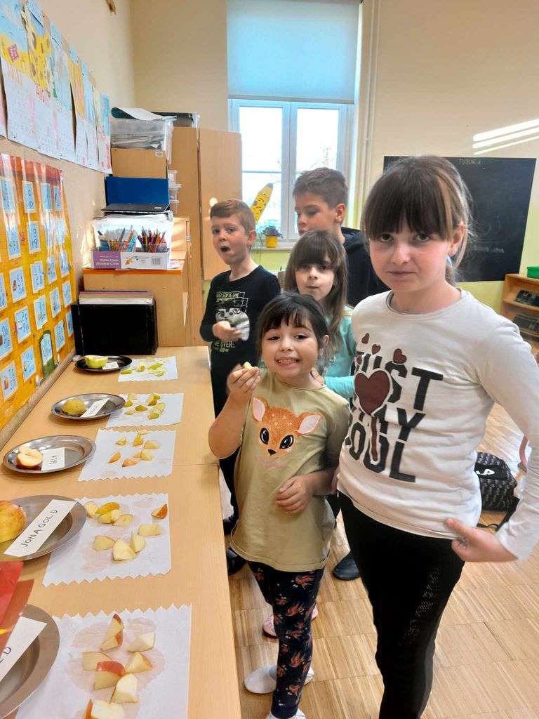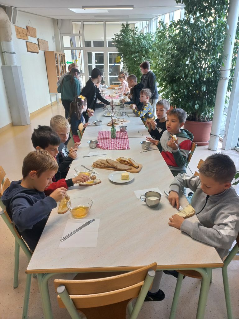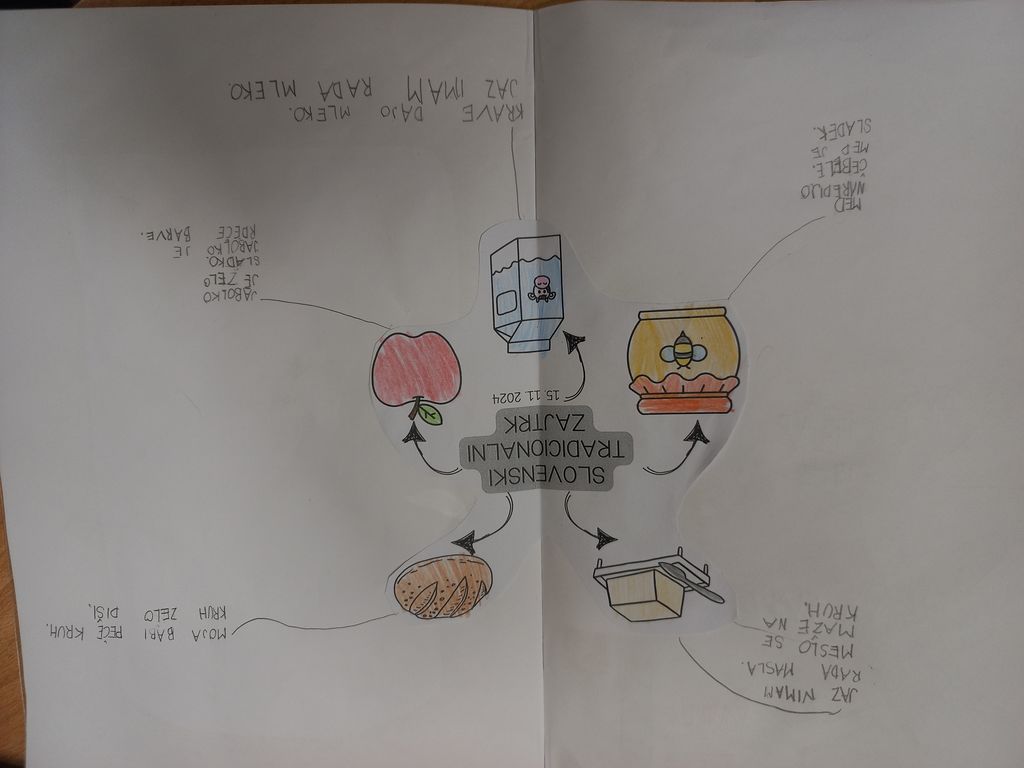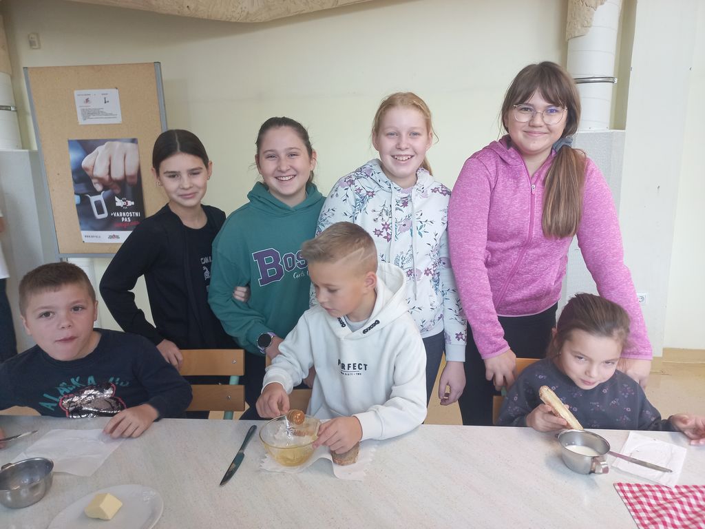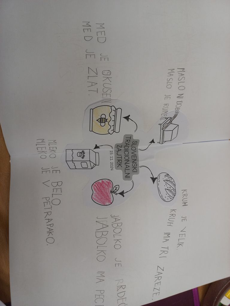 Poleg tradicionalnih slovenskih jedi, ki smo jih okušali v tem tednu, smo pripravili številne dejavnosti, ki se navezujejo na prehrano. V prvem in drugem razredu so se pogovarjali o živilih, jih prepoznavali in razvrščali, si ogledali film o čebelah, ustvarili panjske končnice ter pri RaP-u izdelali čebelice in jabolka iz papirja. V tretjem razredu so imeli »jabolčni dan«. Učenci so se preizkusili v vlogi kuharjev in spekli domači jabolčni štrudelj. Ob tem so spoznali različne sorte jabolk. Pri RaP-u (Znam za več, TJA) v 6. razredu so raziskali, kako nekatere slovenske jedi poimenujemo v angleškem jeziku. Pri tehniškem dnevu pa so učenci izdelali plakat Shema šolskega sadja, zelenjave in mleka ter pridno pomagali pri pripravi in postrežbi tradicionalnega slovenskega zajtrka. Seveda pa nismo pozabili na naše pridne telovadke, ki nam vsak dan v oranžnih jopicah polepšajo še tako megleno in mrzlo jutro. Ob dobrem zajtrku smo malo poklepetali, se spomnili dobrih, starih časov ter se zazrli v prihodnost, ki kliče po novih nalogah, izzivih in dejavnostih, za katere verjamem, da jih bomo uspešno premagovali.