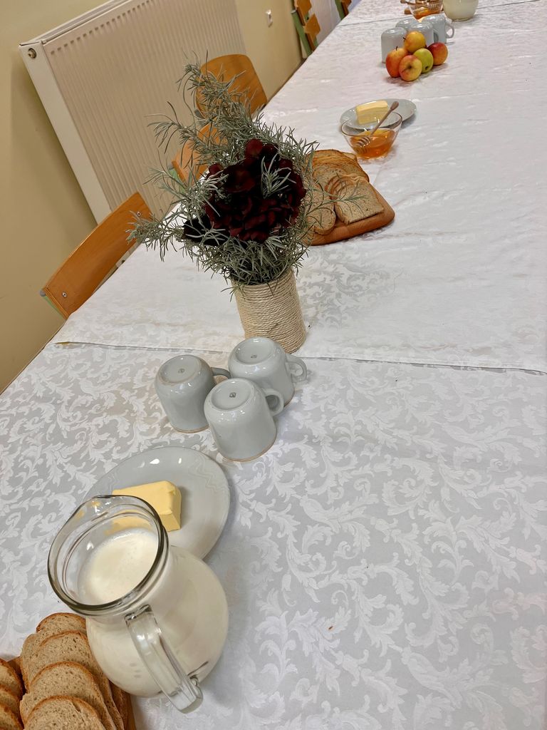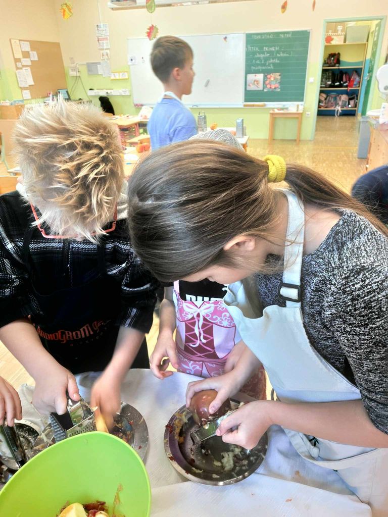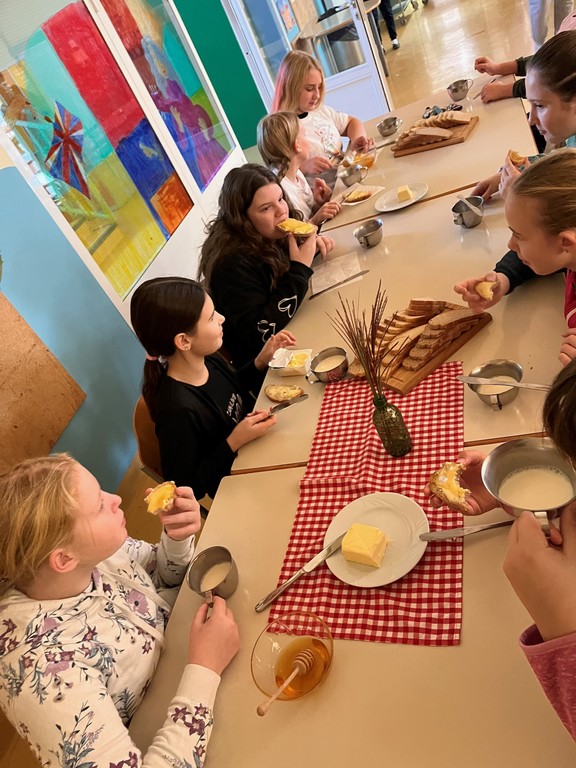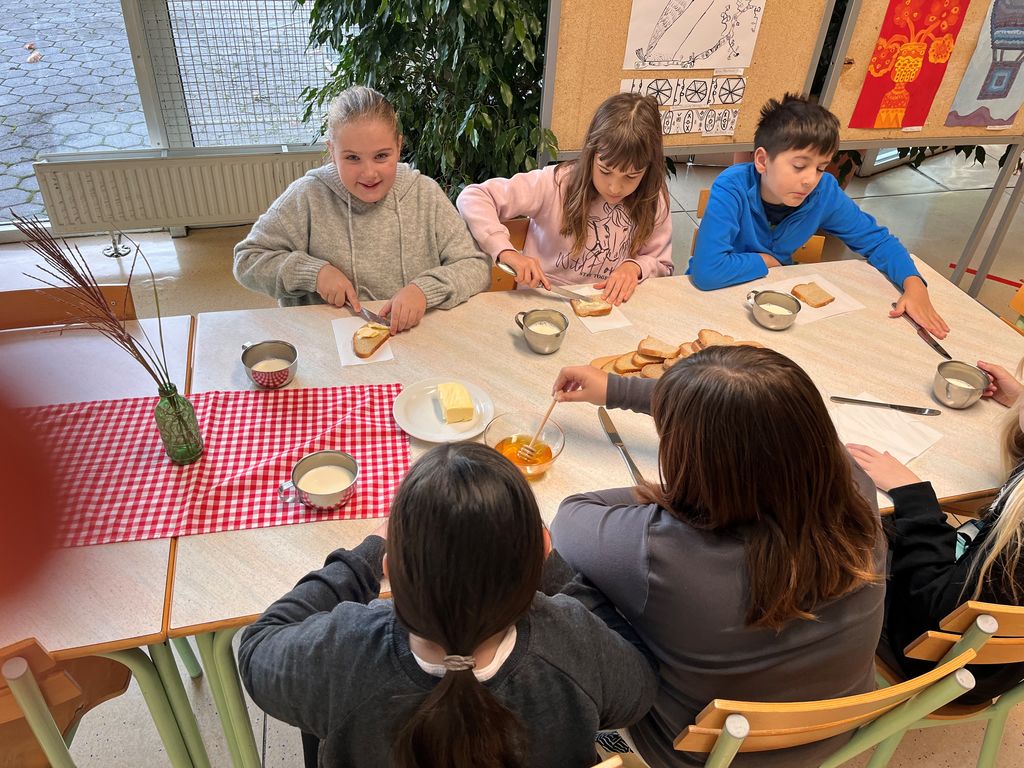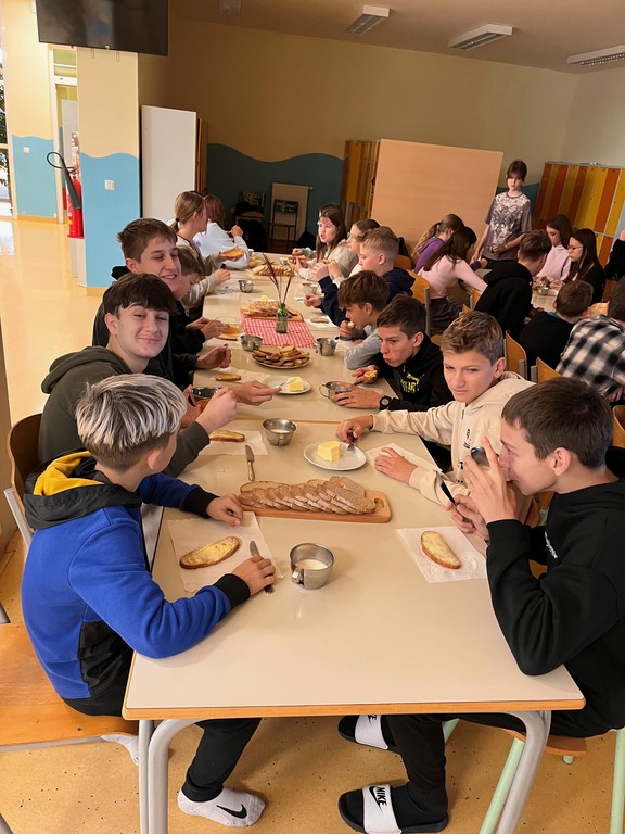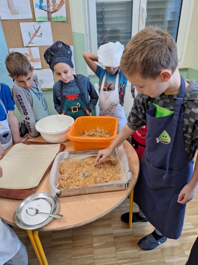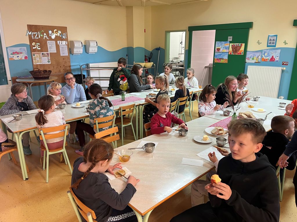 Poleg tradicionalnih slovenskih jedi, ki smo jih okušali v tem tednu, smo pripravili številne dejavnosti, ki se navezujejo na prehrano. V prvem in drugem razredu so se pogovarjali o živilih, jih prepoznavali in razvrščali, si ogledali film o čebelah, ustvarili panjske končnice ter pri RaP-u izdelali čebelice in jabolka iz papirja. V tretjem razredu so imeli »jabolčni dan«. Učenci so se preizkusili v vlogi kuharjev in spekli domači jabolčni štrudelj. Ob tem so spoznali različne sorte jabolk. Pri RaP-u (Znam za več, TJA) v 6. razredu so raziskali, kako nekatere slovenske jedi poimenujemo v angleškem jeziku. Pri tehniškem dnevu pa so učenci izdelali plakat Shema šolskega sadja, zelenjave in mleka ter pridno pomagali pri pripravi in postrežbi tradicionalnega slovenskega zajtrka. Seveda pa nismo pozabili na naše pridne telovadke, ki nam vsak dan v oranžnih jopicah polepšajo še tako megleno in mrzlo jutro. Ob dobrem zajtrku smo malo poklepetali, se spomnili dobrih, starih časov ter se zazrli v prihodnost, ki kliče po novih nalogah, izzivih in dejavnostih, za katere verjamem, da jih bomo uspešno premagovali.
