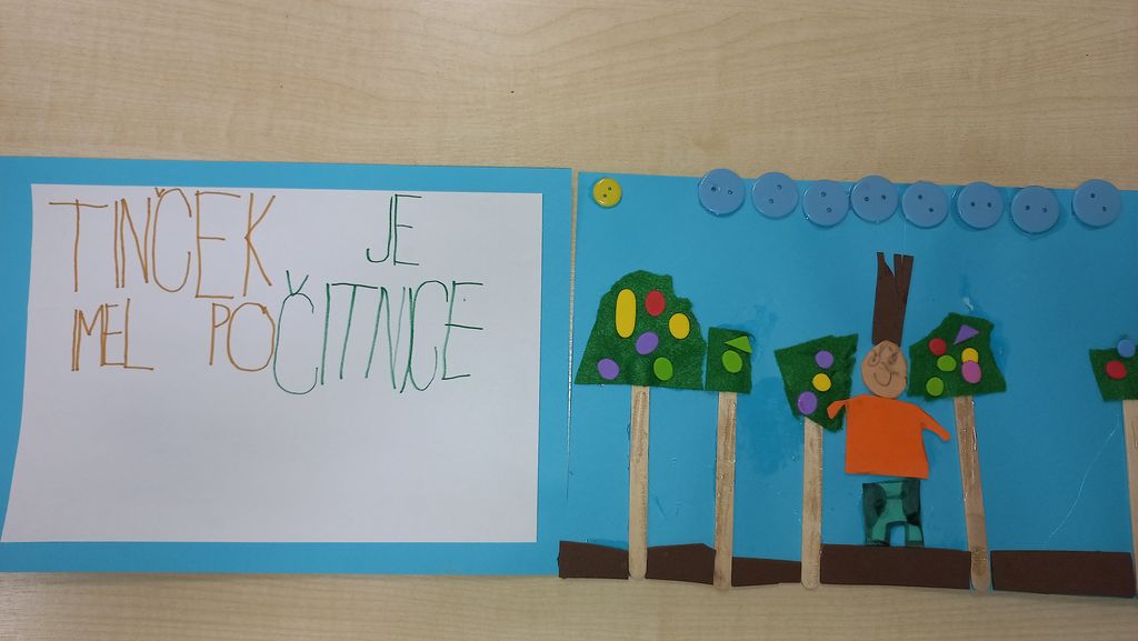 Prvošolci OŠ Cirkovce, ki obiskujejo pravljični krožek, so v okviru projekta NMK izdelali tipno slikanico. Navdih za ustvarjanje je bila slikanica Tinček, ki smo jo prebrali. Pri ustvarjanju smo uporabili liste formata A4, penasto gumo, karton, šeleshamer, lesene palčke, volno, gumbe, vrvico, plasticne slamice, vezalke in filc. Na koncu smo slikanico speli s spiralo.