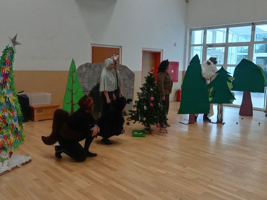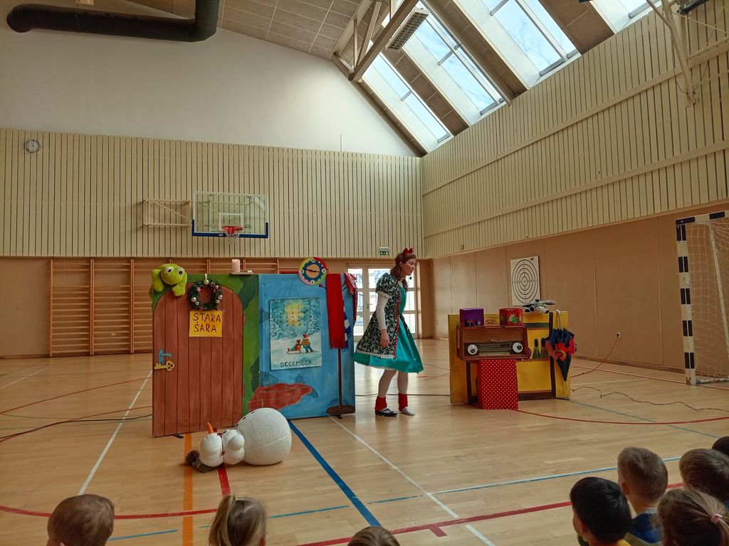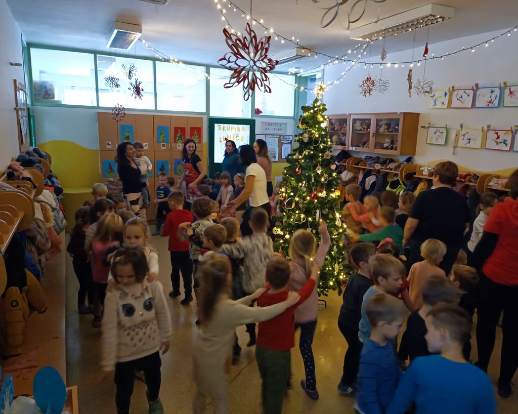 V skupnih prostorih vrtca so otroci okraševali praznično smreko ter ob slovenski glasbi skupaj zaplesali in zarajali. Svojo praznično smreko in snežaka pa so izdelali tudi predšolski otroci in jo razstavili na hodniku šole.