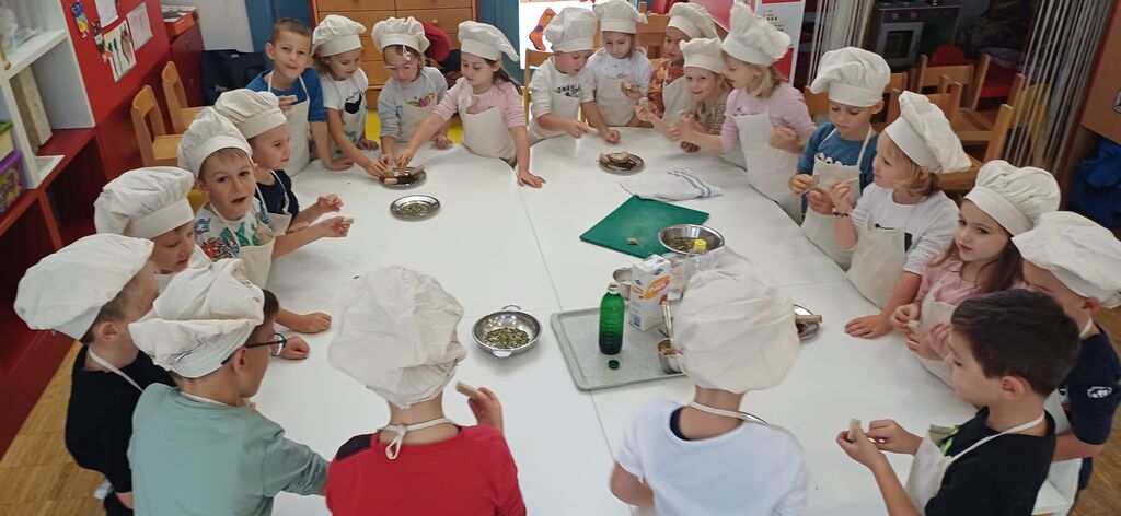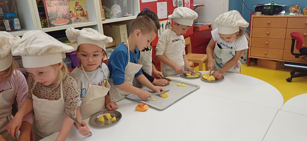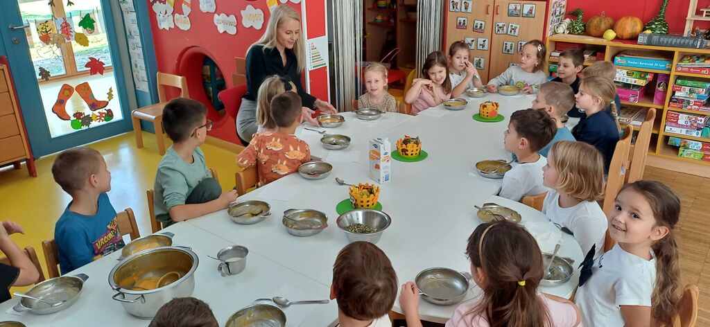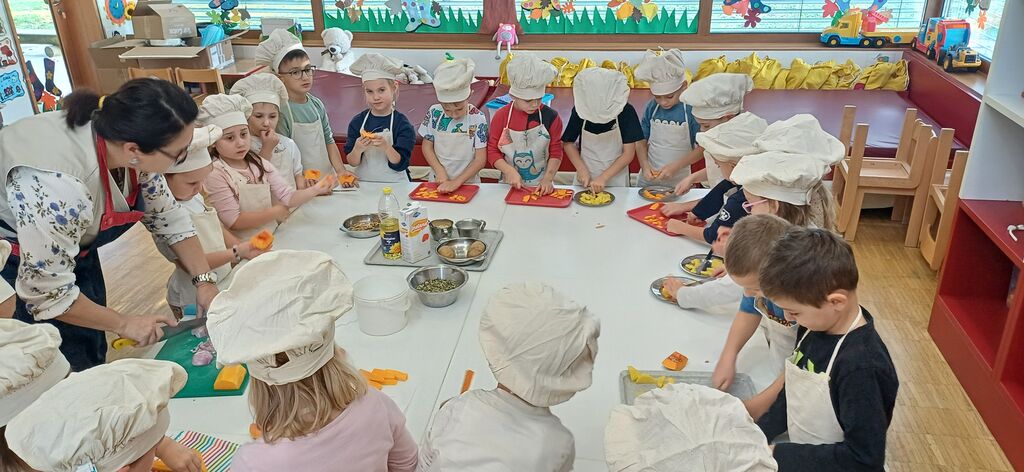 Seznanili smo se s pravljico »Juha, ki iz buče se skuha«, ki nas je nasmejala in navdušila, da smo se tudi sami preizkusili v vlogi malih kuharjev. Buče smo izdolbli in iz papirja izdelovali njihove podobe, nato pa zavihali rokave in se lotili kuhanja prave bučne juhe. Otroci so s pomočjo vzgojiteljic narezali buče, krompir in korenje, nato pa sestavine premešali in z zanimanjem opazovali, kako se juha kuha. Medtem ko se je juha kuhala, smo poskusili tudi domače bučno olje, bučna semena, svež kruh in celo jabolka, polita z bučnim oljem, kar nas je prav prijetno presenetilo. Okusi so bili čudoviti, otroci pa so z navdušenjem pripovedovali, katera jed jim je bila najbolj všeč.