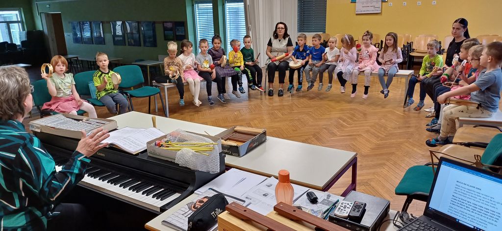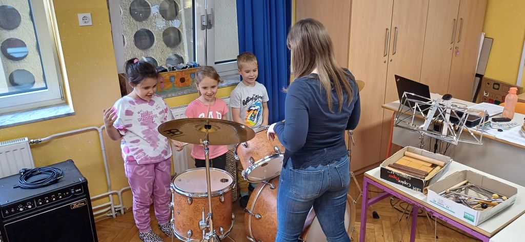 Najprej smo raziskali male ritmične instrumente, se navduševali nad zvoki klavirja in se naučili novo pesmico. Otroci so z veseljem igrali na ropotuljice, triangel, kastanjete, bobne, tamburin, palčke in druge zanimive pripomočke, s čimer so razvijali svoj glasbeni posluh, občutek za ritem in predvsem veselje do skupnega ustvarjanja. Pridružil se nam je tudi učenec Leo Ogrizek, ki nam je predstavil kahon in bobne.