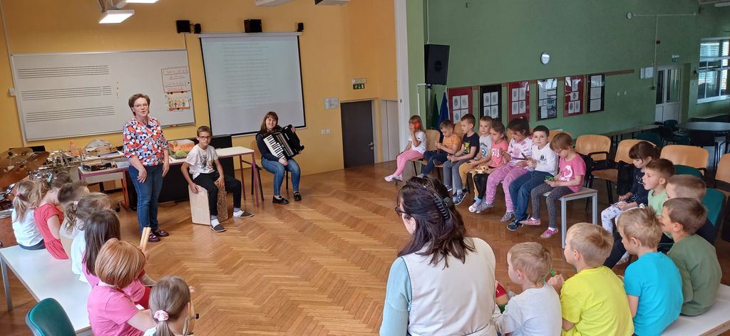 Po tednu dni smo ponovno obiskali glasbeno učilnico. Tam nas je toplo sprejela učiteljica glasbe, gospa Liljana Krošl, skupaj s svojo praktikantko. Tokrat so imeli otroci priložnost preizkusiti tudi harmoniko, bobne in kahon in prav vsak se je z veseljem preizkusil v vlogi malega glasbenika. Prepevali smo znane pesmice, se gibali ob ritmu in skupaj ustvarjali prijetno vzdušje.