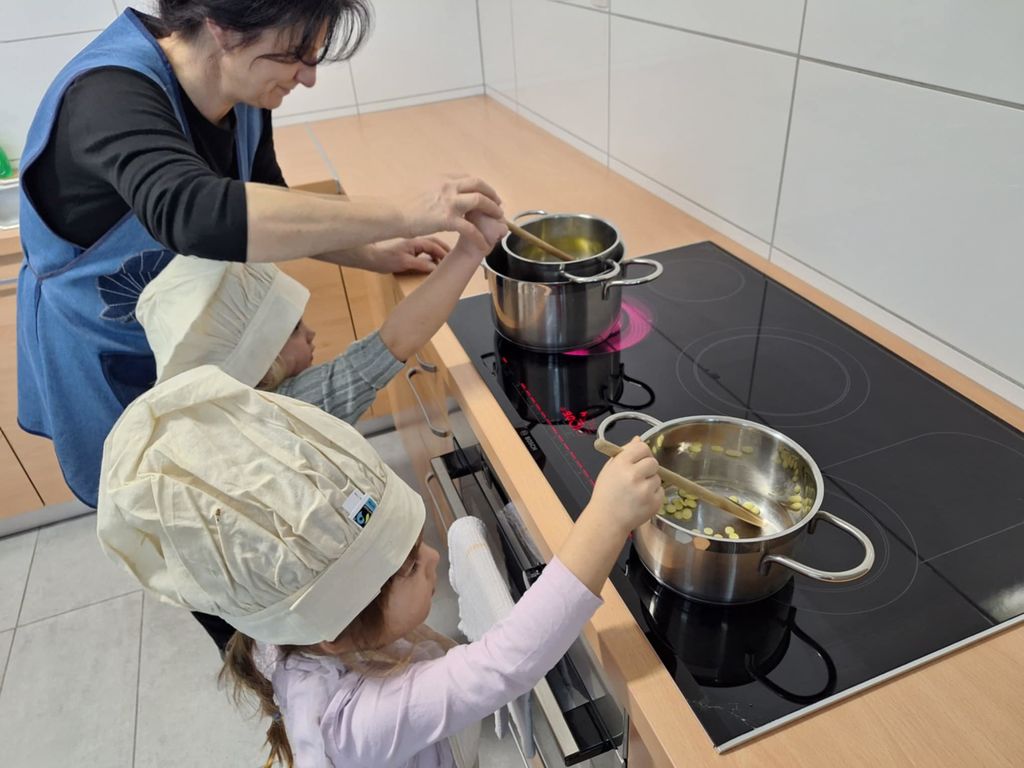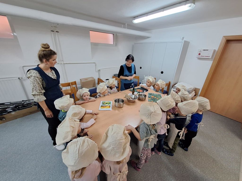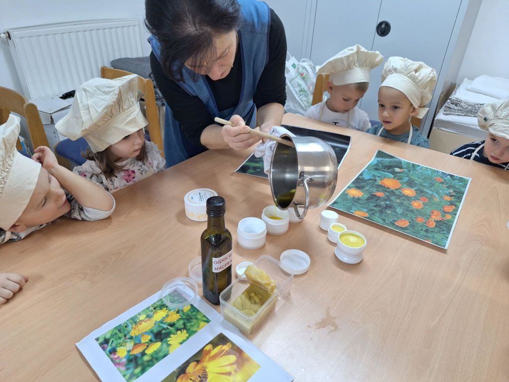 V mesecu novembru smo se lotili izdelave mazila. S skupino Stonoge smo se odpravili v našo učno kuhinjo. Vzgojiteljica je otrokom pokazala material in sestavine za mazilo. Sestavine in pripomočki, ki smo jih potrebovali, so bili: ognjičev macerat, čebelji vosek, kakavovo maslo, lonec za segrevanje, lesene žlice za mešanje in majhne posodice za shranjevanje. Otroci so radovedno vonjali in otipavali sestavine. Na vodni kopeli smo raztopili čebelji vosek, dodali ognjičev macerat in kakavovo maslo. Otroci so opazovali taljenje ter navdušeno opisovali, kaj vidijo. Ko so se vse sestavine stopile in povezale, so otroci z leseno žlico premešali zmes, ki je nastala. Sledilo je polnjenje posodic. Vzgojiteljica je previdno nalivala mazilo v pripravljene posodice, primerne za shranjevanje. Mazilo smo nato shranili v temen prostor, da se je popolnoma ohladilo in strdilo.