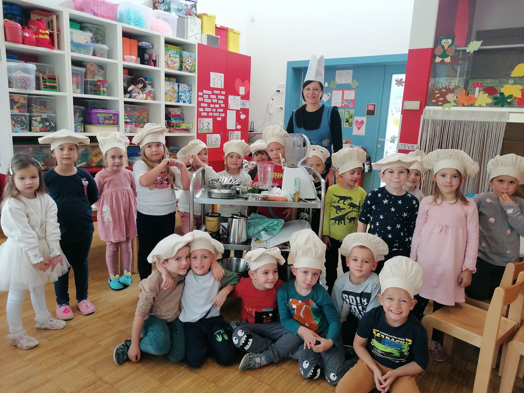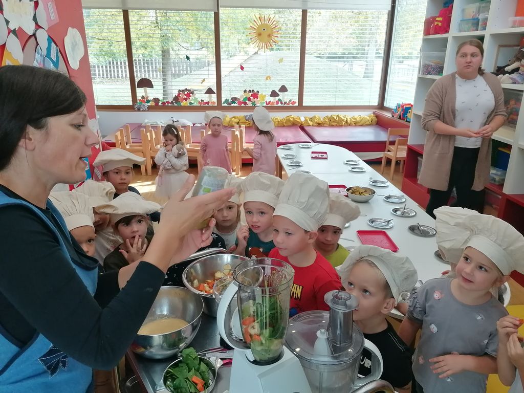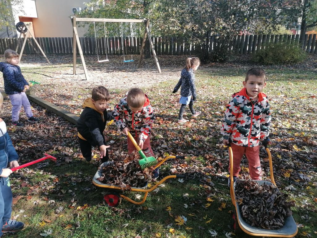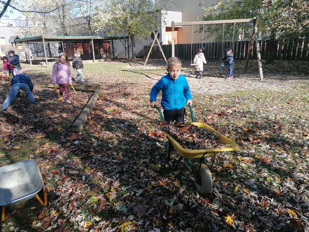 Kako čudovita je narava jeseni, ko so drevesa odeta v škrlatne barve, in ko veter vrtinči listje! Jesen je čas, ko narava spreminja svoje barve in pušča za seboj listje, kar pa prinaša delo in skrb otrokom tudi v našem vrtcu. Veselo smo zavihali rokave in se podali na igrišče našega vrtca, kjer smo z velikim veseljem poprijeli za samokolnice, grablje in lopatke ter napolnili vreče z listjem, ki smo ga odnesli v gozd ob vrtcu. Tudi na vrt nismo pozabili. Pobrali smo pridelke, ki smo jih posejali in posadili čez leto. Z veseljem smo jih uporabili pri kuharskem tečaju, ki se odvija v našem vrtcu. Vso zelenjavo z vrta smo skupaj s sadjem narezali, jo dali v mešalnik ter si naredili prav okusen in zdrav sadno-zelenjavni napitek, katerega se nihče ni branil. Skupaj smo ugotavljali, kaj vse nam narava ponuja in kako bogata je ta jesen.