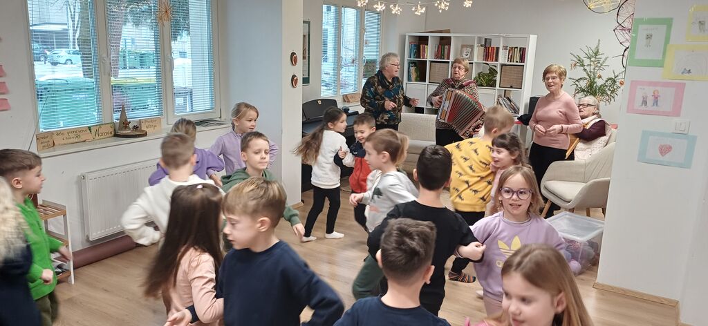 Druženje se je nadaljevalo ob skupnem petju, plesu in prijetnem klepetu. Otroci so z zanimanjem poslušali ljudske pesmi, sodelovali pri plesu ter spoznavali delček naše bogate kulturne dediščine. Veselje, smeh in radovednost so napolnili prostor, povezovanje med generacijami pa je potekalo povsem spontano.