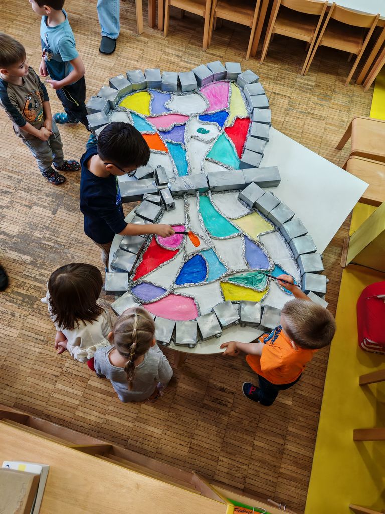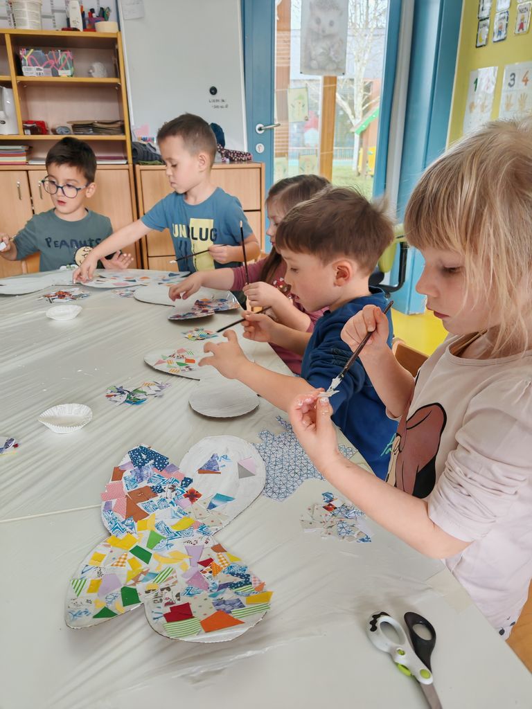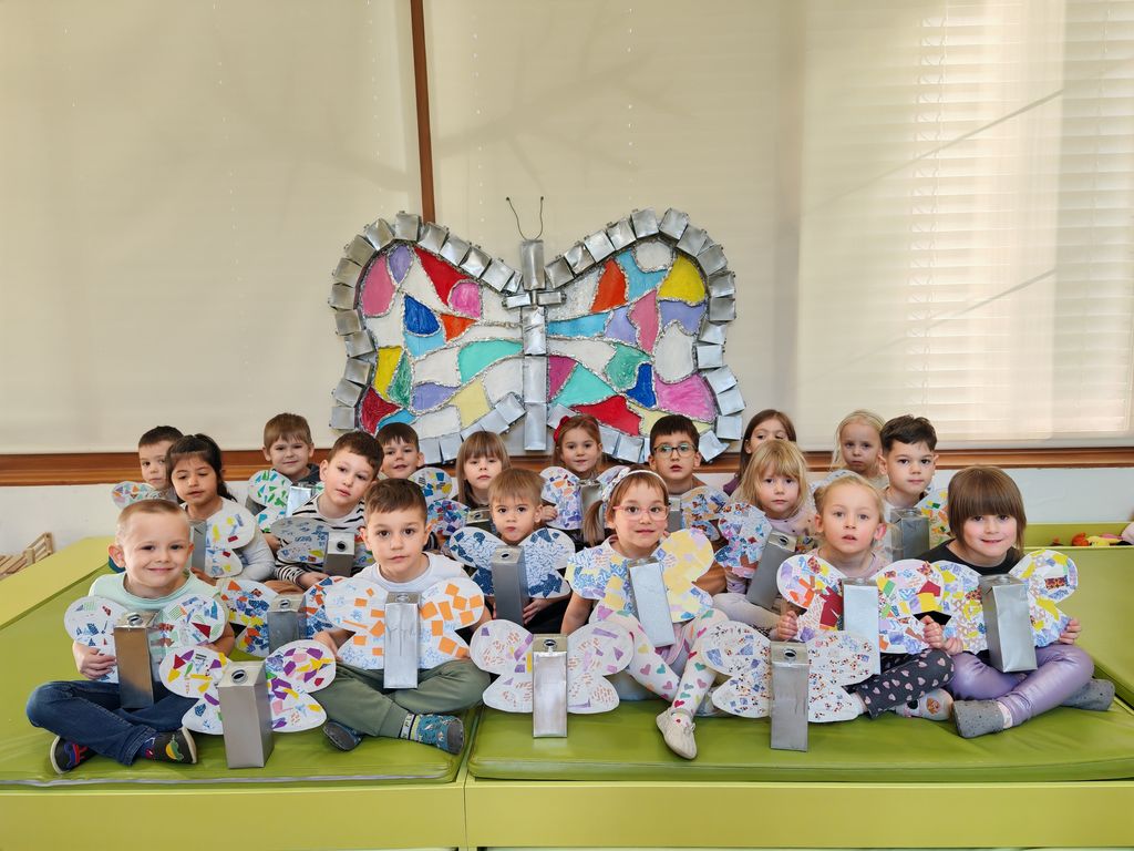 Otroci so bili tako navdušeni, da smo nadaljevali z delom. Vsakemu izmed otrok smo iz debelejšega kartona izrezali obliko metuljevih kril. Prav tako je vsak izmed otrok dobil embalažo, pobarvano s srebrno barvo. Iz tega smo izdelali metuljčke, ki bodo poleteli v njihove domove in krasili njihove sobe. Krila smo opremili v stilu mozaika. Otroci so pridno rezali barvne lističe in jih lepili na predhodno pobarvana bela krila. Urili smo spretnosti s škarjami in fino motoriko z zlaganjem majhnih koščkov lističev. Vsak je ustvaril svojega čarobnega metuljčka, na katerega je bil izredno ponosen. Otroci so z veseljem z njimi tekali po igralnici in se igrali.