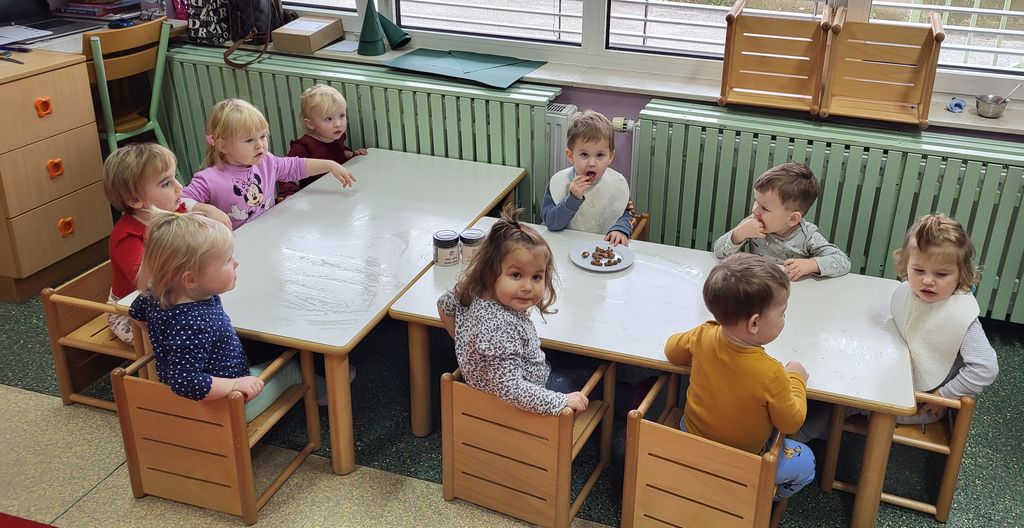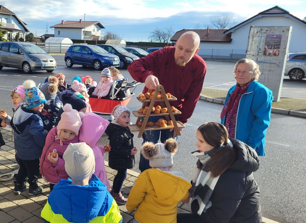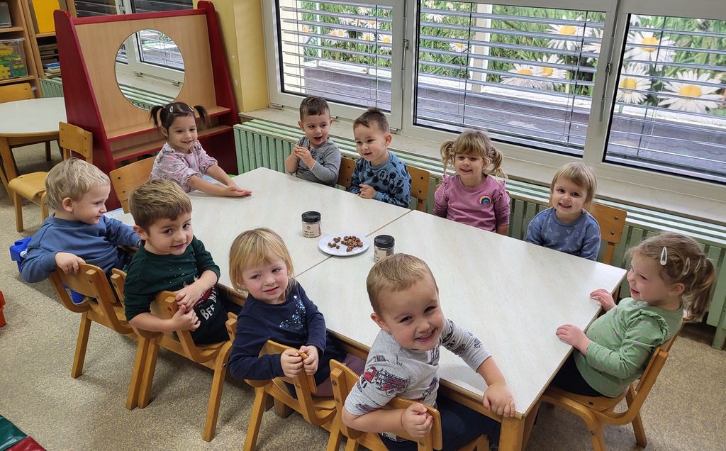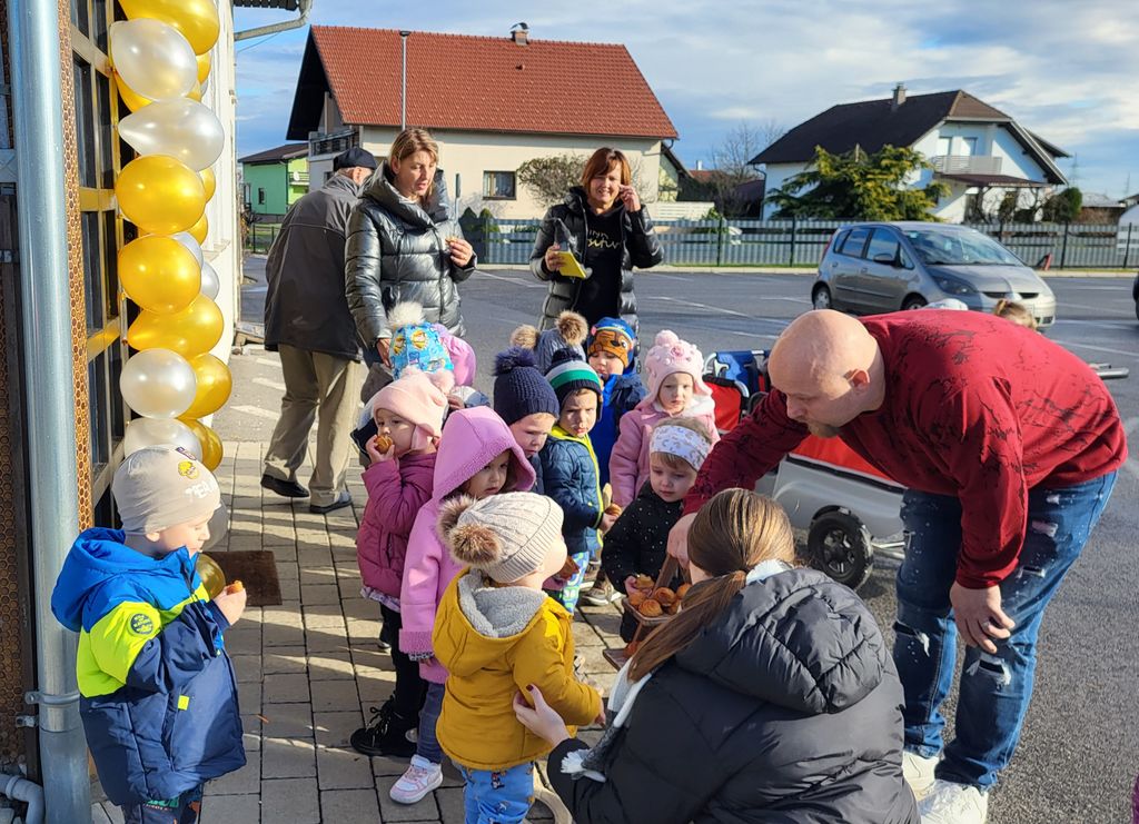 Za začetek so se otroci posladkali z okusnimi rogljički. Vsak grižljaj je prinesel iskrice sreče v njihove oči. Največje presenečenje pa sta pripravila pradedek in prababica naše deklice, ki sta nas prijazno pogostila s čudovitimi čokoladnimi pralinami. Otroci so z navdušenjem poskusili sladke dobrote, ostali pa smo občudovali trud in ljubezen, ki sta ju vložila v ta sladki trenutek.