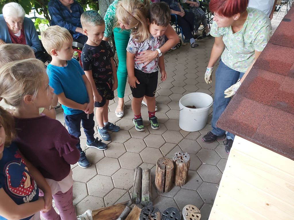 Polni veselja in dobre volje smo se odpravili proti domu, kjer so nas že čakali naši starejši. Ta lep septembrski dopoldan smo si popestrili z izdelavo panja za žuželke. Delavka, zaposlena v domu, nam je najprej postavila nekaj vprašanj o žuželkah, mi pa smo ji polni znanja odgovorili. Podala nam je navodila in nam opisala, kako bomo skupaj izdelali panj za žuželke. Ogrodje panja je bilo postavljeno v obliki hiške, otroci pa so ga dodelali do končnega videza. Pridno so zavihali rokave in se lotili dela. V vsako okence so polagali naravne materiale, kot so storži, veje, drva …