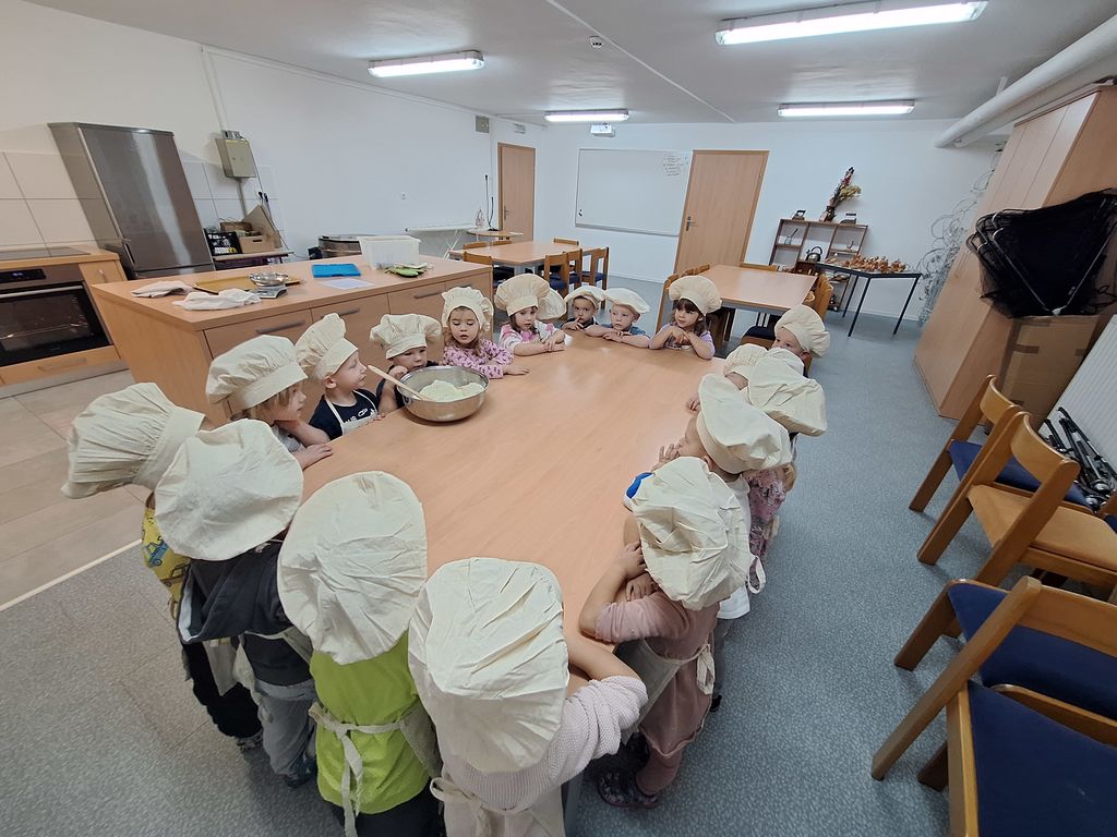 Dejavnost smo začeli z umivanjem rok in pogovorom o higieni med kuhanjem. Nato smo skupaj prebrali recept in se lotili dela. Otroci so pomagali tehtati sestavine in jih dodajati v veliko posodo. Vsak je imel priložnost premešati testo, kar je bilo eno izmed najbolj zabavnih delov dejavnosti. Pripravljeno testo sva z vzgojiteljico razdelili otrokom, da so iz njega oblikovali polmesece – lunice. Ko smo napolnili pekače, smo jih previdno postavili v pečico. Medtem ko so se rogljički pekli, je v prostoru že zadišalo po sladkem in otroci so nestrpno čakali, da jih bodo lahko pokusili. Med čakanjem smo imeli kratek pogovor o tem, kako toplota vpliva na testo in zakaj se rogljički v pečici spečejo. Otroci so delili svoje misli in ugibanja, kar je dejavnosti dodalo izobraževalno noto.