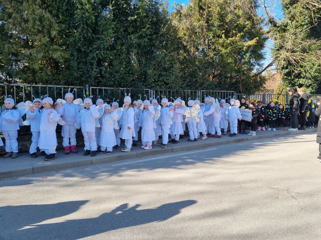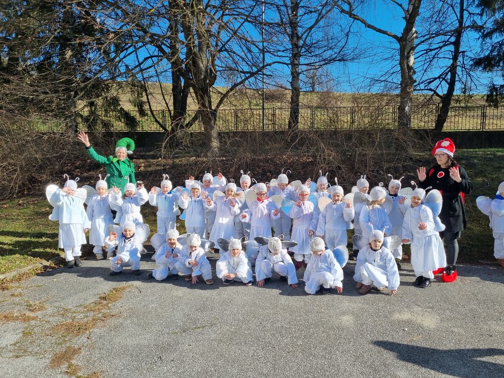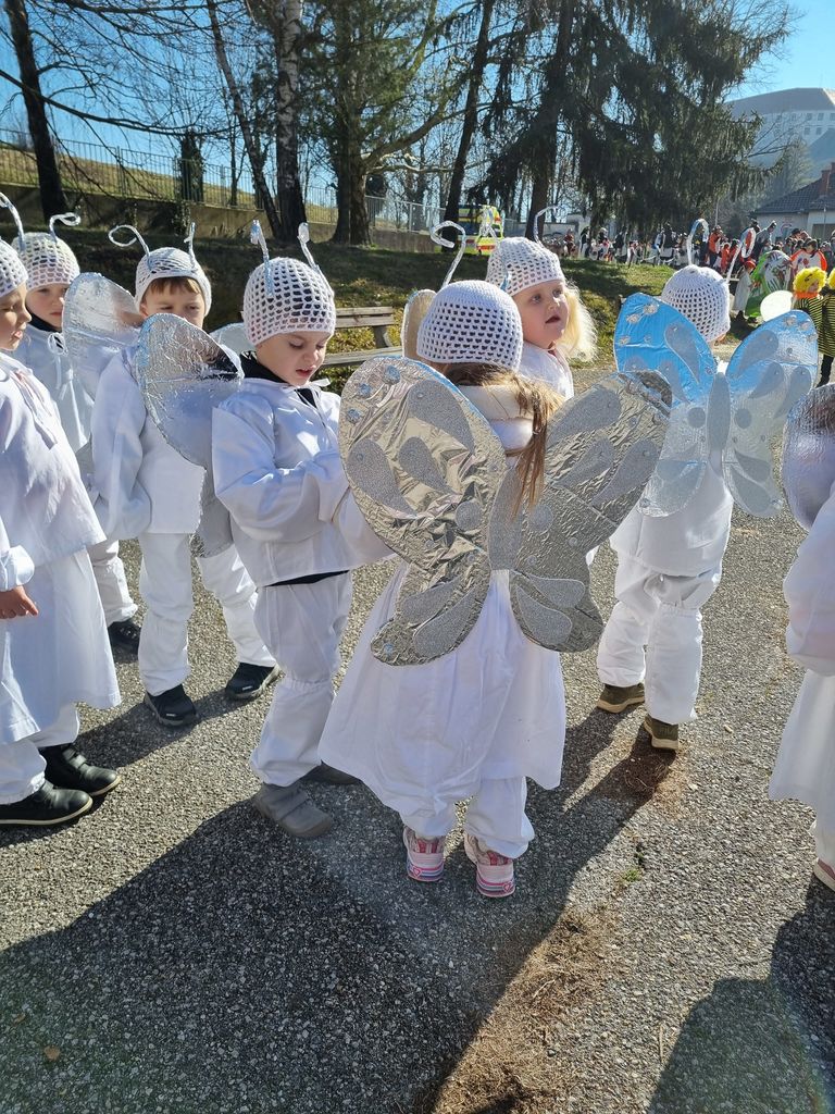 Tudi letos smo, tako kot vsako leto, pridno pripravljali pustne kostume. Letošnja tema je bila »Metulji in gozdna čarovnija«. Navdih za masko nam je bila 70. obletnica tovarne Talum in njihov simbol – metulj. Otroci so imeli kostume metuljev, vzgojiteljice pa smo se oblekle v škrate in vilo. Otroške pustne povorke, ki je potekala v ponedeljek, 3. marca 2025, sta se udeležili skupini Veverice in Sove.