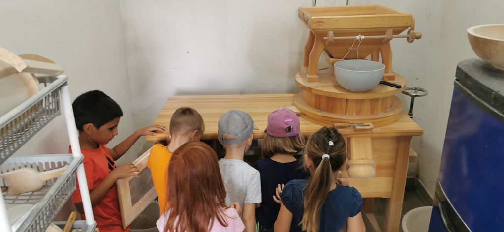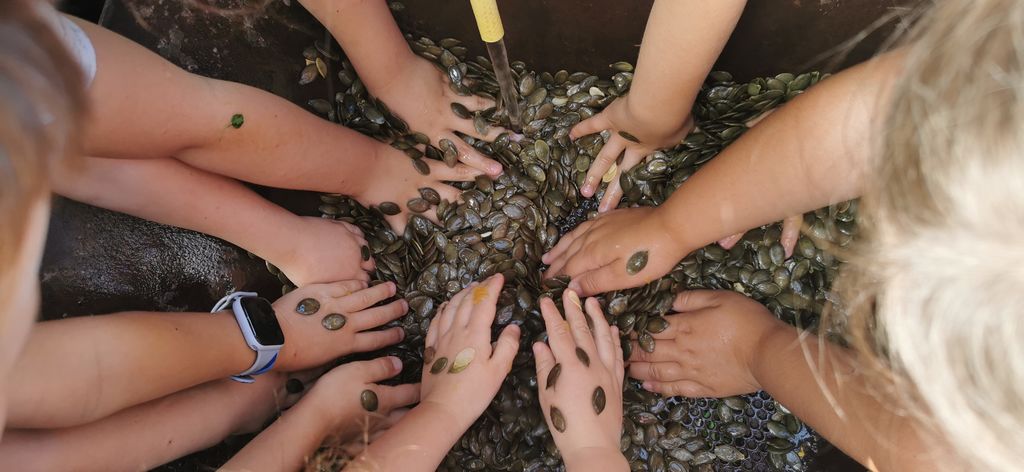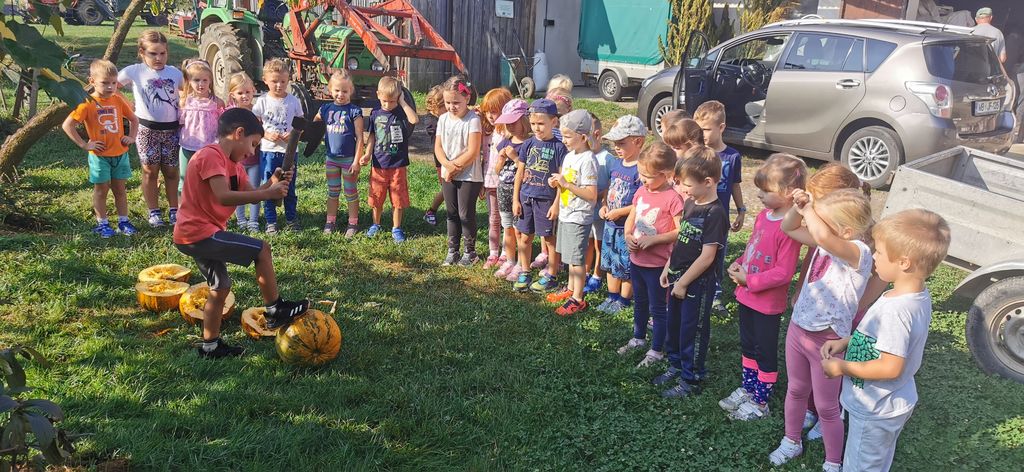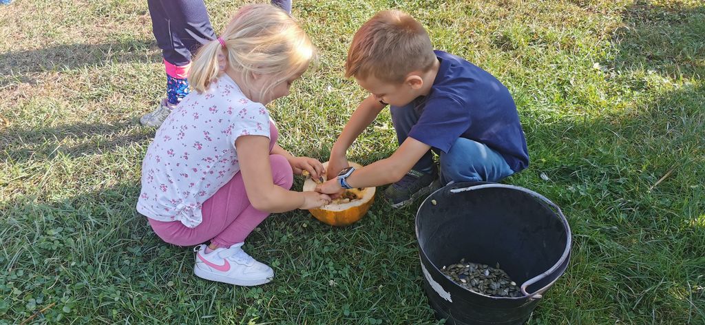 Otroci so se preizkusili v trebljenju buč in pridobili zajetno količino bučnic, nato pa so jih skrbno oprali. Seznanili smo se s sušilnico bučnic, z domačim mlinom ter z izdelavo različnih mok. Ga. Maja nas je pogostila z domačim zeliščnim čajem ter s pecivom iz bučne in pirine moke. Nato smo si ogledali tudi skrbno negovan vrt ter kokoši in račke. Nekatere otroke je očaral velik traktor s prikolico, druge pa majhen kuža.