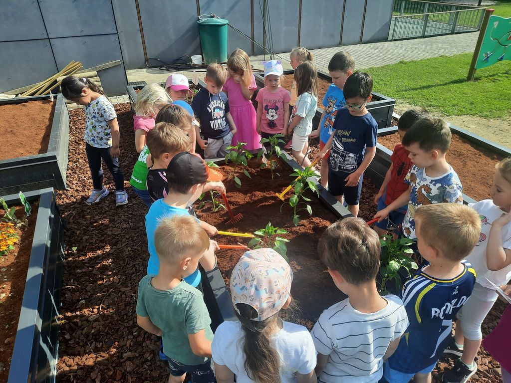Vsaka skupina otrok je dobila svojo visoko gredo, za katero bo skrbela skozi vse leto – od priprave, sajenja, zalivanja, pa do obiranja pridelkov. Z velikim veseljem smo se lotili sajenja in sejanja prvih rastlin. Zasadili smo različno zelenjavo, zelišča in cvetlice, ki bodo krasile naše grede. Otroci so sodelovali z velikim zanimanjem. Po zaključku so ponosno pokazali, kaj so posadili, kar je še povečalo njihovo zadovoljstvo.