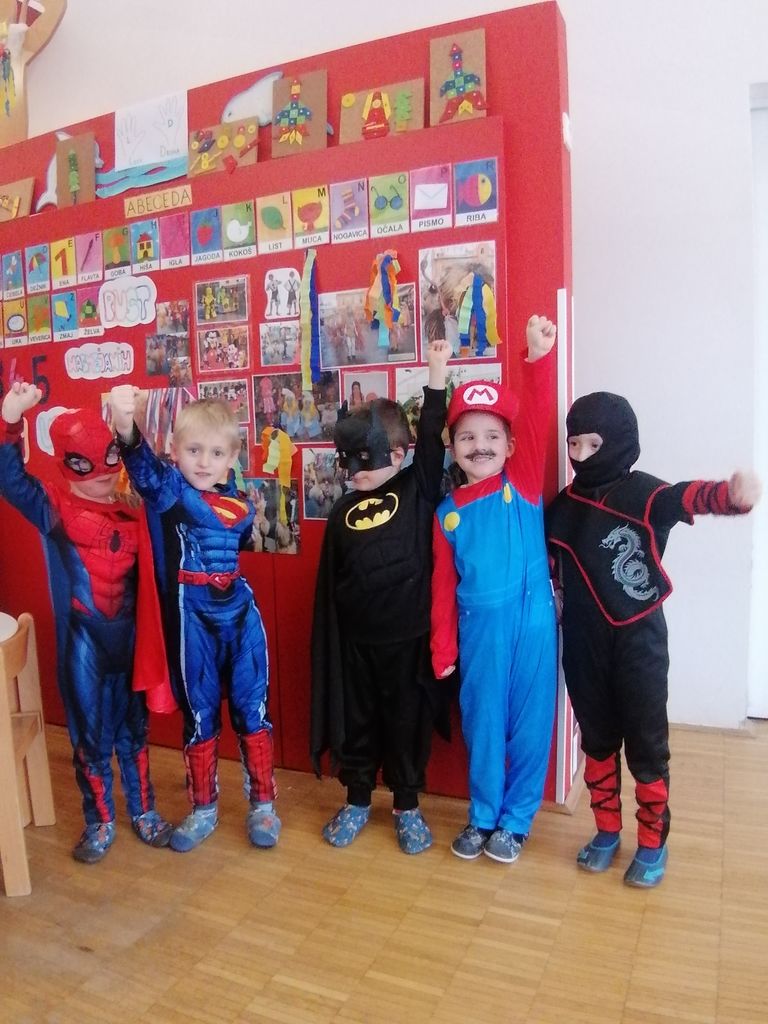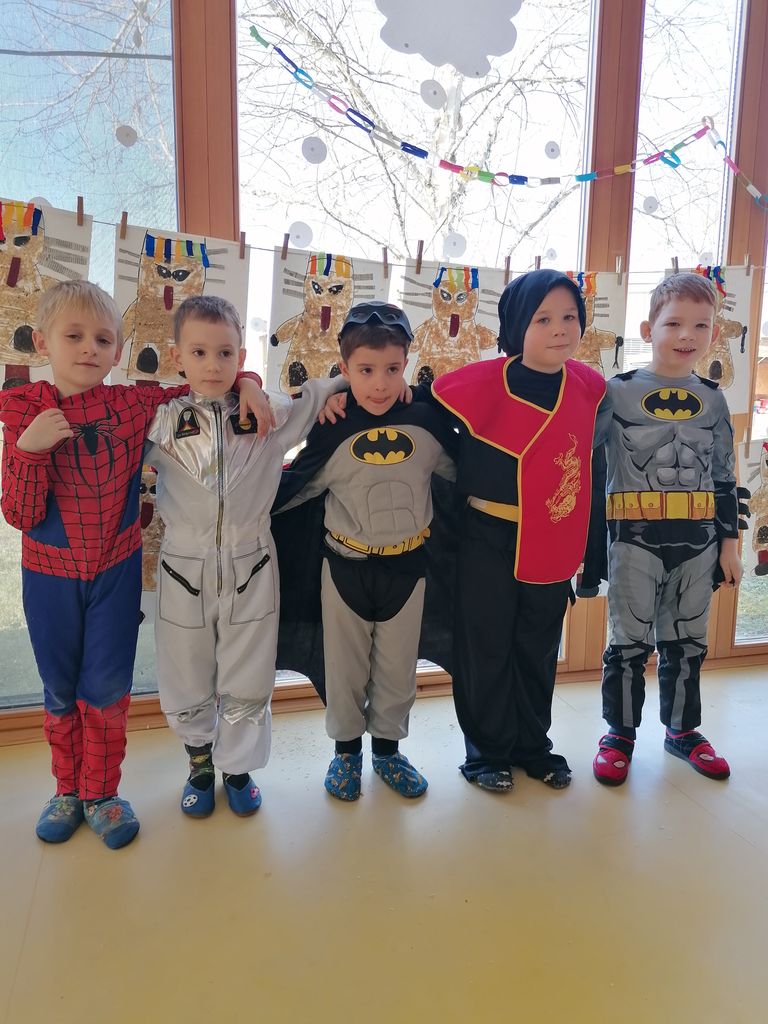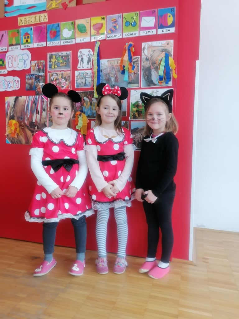 Pustni čas se je začel s krofi, katerim se ne more nihče upreti. Hodnike smo popestrili s pustno dekoracijo in otroškimi izdelki na pustno temo. Vsaka skupina je izdelala pom pome, kape picekov, klovnske klobuke, pustne maske, kurente. Otroci so nestrpno pričakovali svoje prijatelje, da bi se med seboj občudovali ter primerjali maske in kostume. Ponosno so se predstavljale vile, princeske, Miki miške, pikapolonice, metulji, srnice, medvedki, Spidermani, Supermani, policaji, gasilci, nindža bojevniki ter še veliko drugih likov.