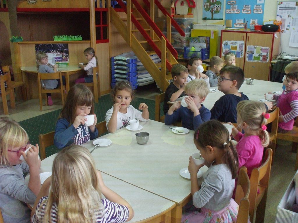 Pogovorili smo se o pomenu zdrave prehrane, si natančneje ogledali, kakšni so bacili, se naučili pravilno umivati roke, priredili čajanko z zeliščnimi čaji, imeli tradicionalni slovenski zajtrk, se veliko gibali na prostem in v telovadnici ter se še posebej posvetili negi svojih zob. Za zaključek smo spekli kruh oz. žemljice iz pirine moke.