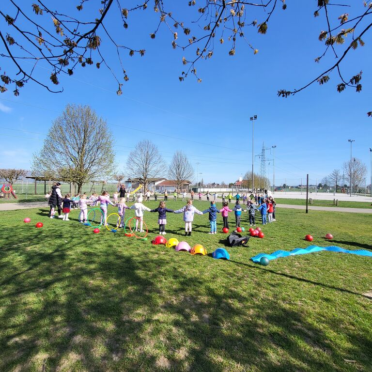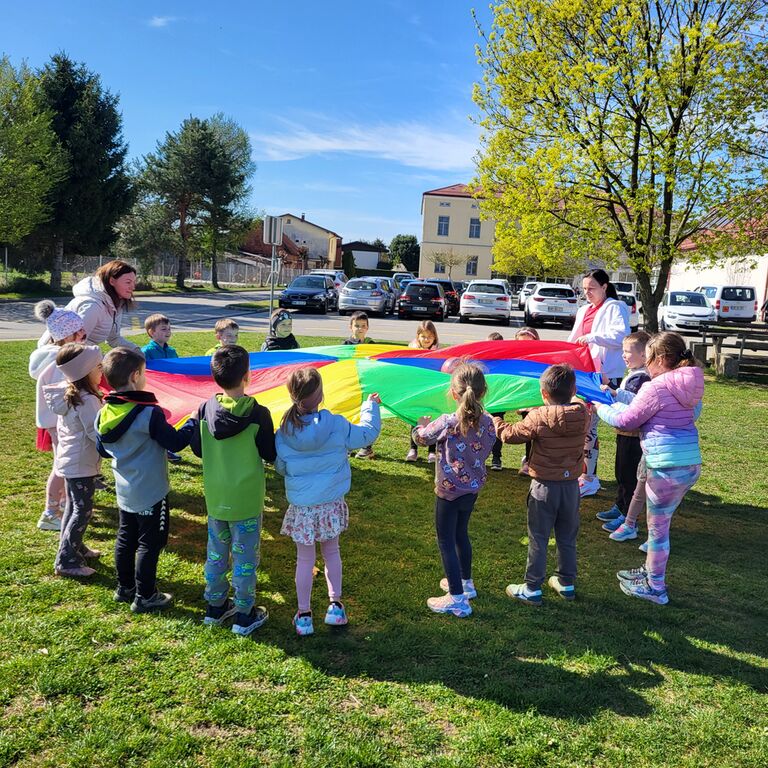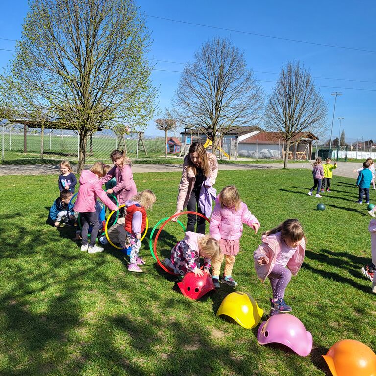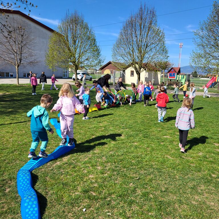Dan smo začeli z jutranjim razgibavanjem. Ob prijetni glasbi smo se skupaj ogreli, raztegnili in pripravili na aktivno dopoldne. Po ogrevanju so se otroci razporedili po različnih igralnih postajah. Na vsaki postaji jih je čakala nova naloga – od poligonov spretnosti, padala, metanja žogic na cilj, pa do ravnotežnih vaj in teka. Igre so spodbujale sodelovanje, vztrajnost, koordinacijo in predvsem veselje do gibanja.
