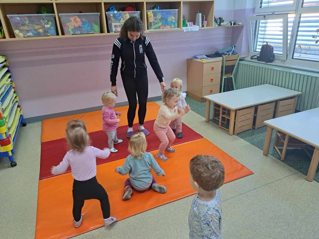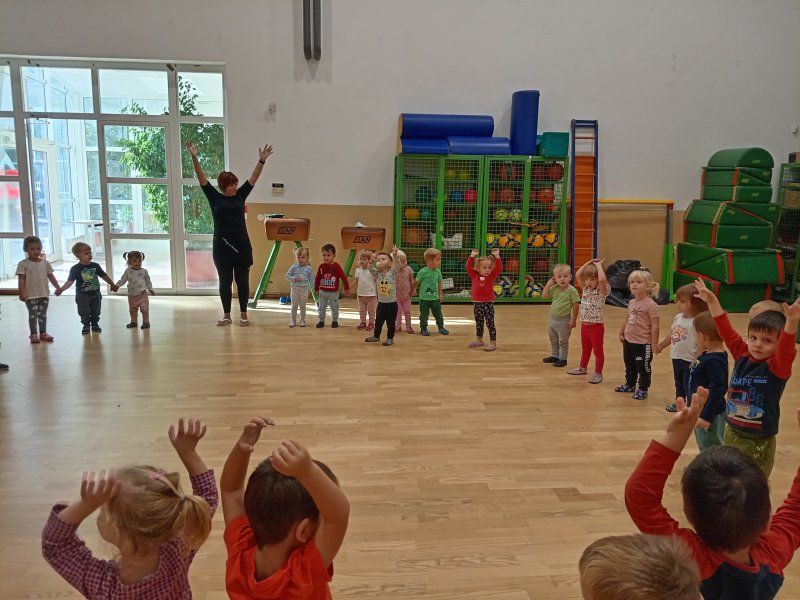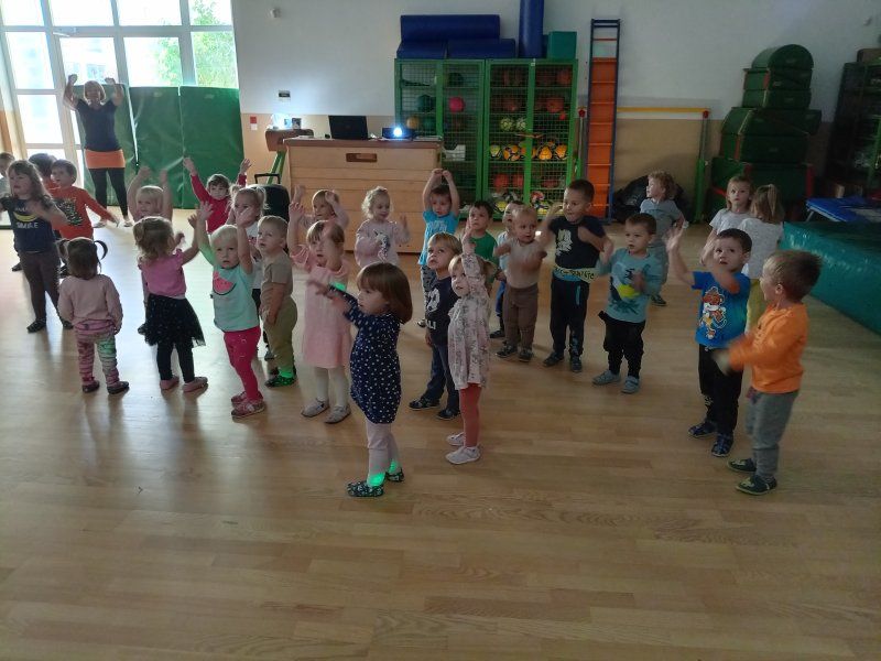 V petek pa smo se razgibali ob zvokih glasbe v mali telovadnici. Vzgojiteljice smo pripravile lučke in projekcijo, ob kateri smo veselo zaplesali.