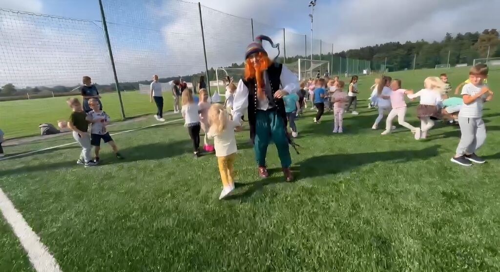 Pred vrtcem nas je presenetil naš dober prijatelj škrat Bradač. Otroci ga zelo dobro poznajo in ga imajo radi, saj nam vedno prinese dobro voljo. Tokrat nam je povedal, zakaj je gibanje tako pomembno: da smo bolj zdravi, močni, veseli in polni energije za igro. Potem pa nas je spodbudil: »Otroci, zdaj pa gremo teč!«