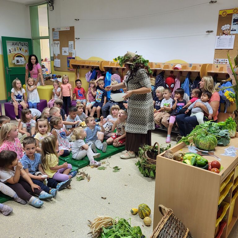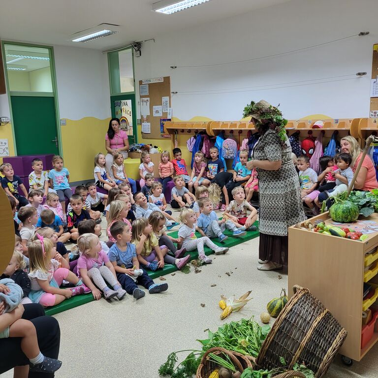 Na prvi jesenski dan je otroke v Vrtcu Cirkovce obiskala prav posebna gostja – tetka Jesen. V svoji pisani obleki, s košaro jesenskih zakladov in s toplim nasmehom je pričarala pravo jesensko vzdušje.