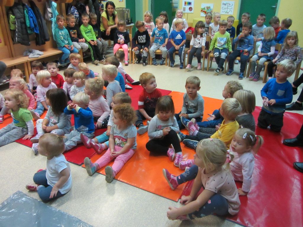 V ponedeljek, 23. 9. 2019, nas je v večnamenskem prostoru vrtca Cirkovce obiskala tetka Jesen. V prostor je privihrala s klobukom, okrašenim z jesenskim listjem ter s svojo rjavo - oranžno opravo in s sabo prinesla polno košaro jesenskih pridelkov. Skupaj z otroki so poimenovali pridelke iz košare in se o njih pogovorili.
