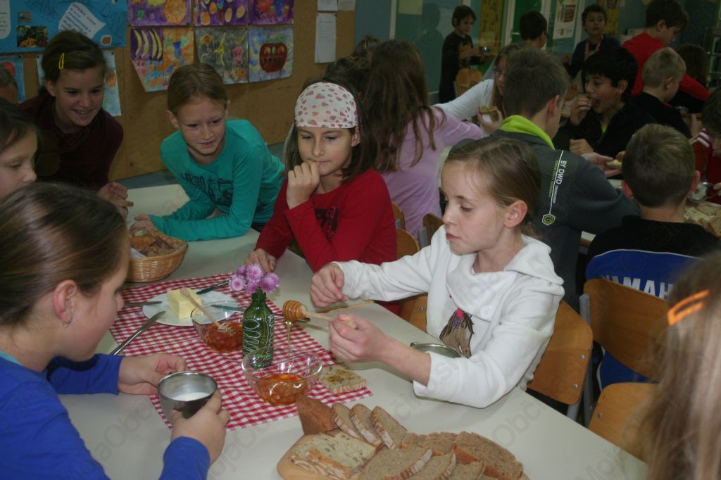 Gospa Žitnik nam je pripeljala še topel kruh, pečen v krušni peči. Otroci in učenci so lahko poskusili kruh s semeni, pirin in rženi kruh, na katerega so si pridno mazali maslo in med. Gospa Medved nam je priskrbela domači med, na stojnici pa je predstavila še ostale »medene« izdelke. Izdelke iz mleka, predvsem sir, sir za žar in domače maslo, je na stojnici predstavila gospa Kotnik, hkrati pa otrokom pojasnila, kako pridobimo določen izdelek.