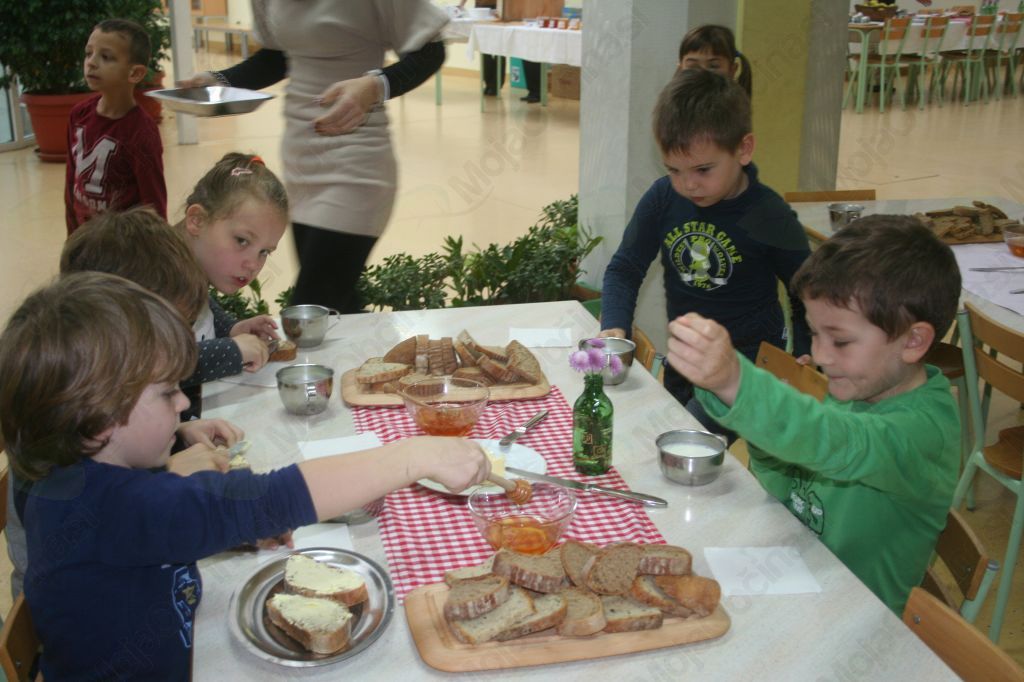 Ta dan smo otrokom v vrtcu in učencem v šoli ponudili domači kruh, med, maslo, mleko in jabolka lokalnih proizvajalcev.