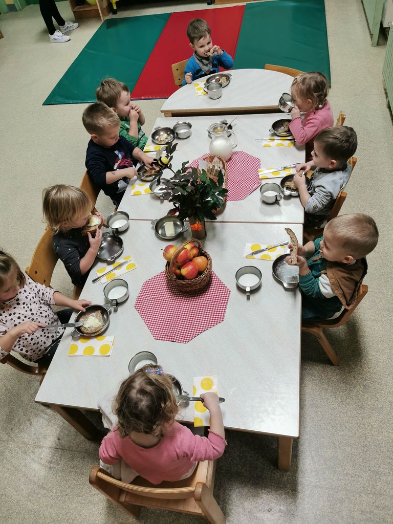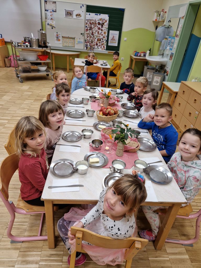 V našem vrtcu in šoli redno praznujemo dan hrane ter sodelujemo pri projektu Tradicionalni slovenski zajtrk. Ta je letos potekal že dvanajsto leto zapored, na tretji petek v novembru. V sklopu projekta predstavljamo otrokom pomen rednega in zdravega prehranjevanja ter jim približamo domačo, lokalno pridelano hrano. Letošnji slogan je bil »Zajtrk z mlekom – super dan!«, zato smo jim predstavili, kako dobimo mleko, ki ga pijemo. Po dolgem času smo imeli priložnost poskusiti domače mleko, ki nam ga je podarila kmetija Napast.