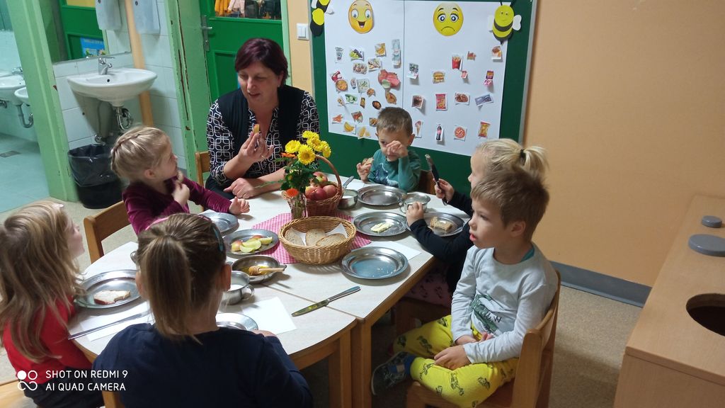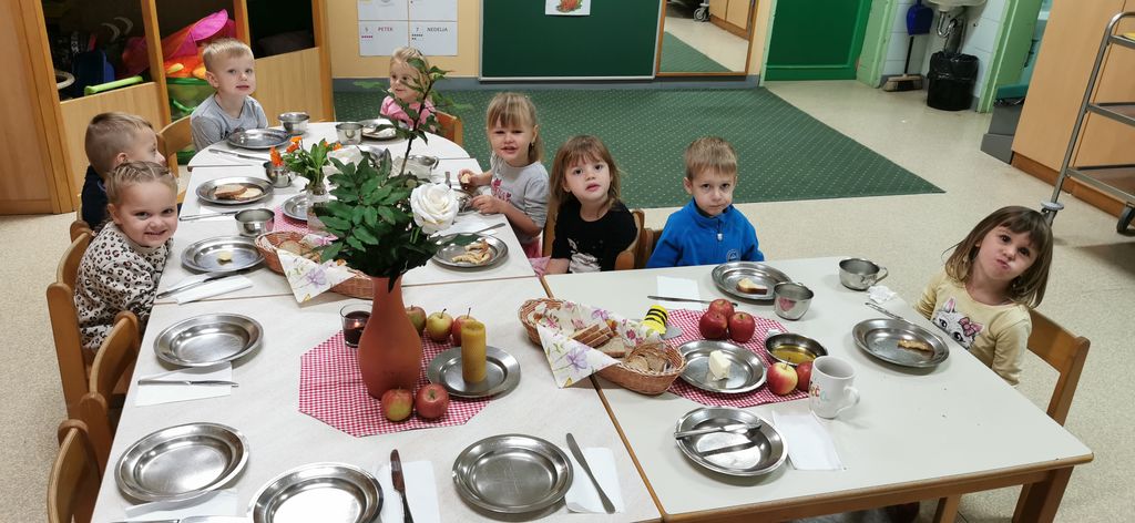 Na dan slovenske hrane so imele vse skupine lepo pogrnjene mize, na katerih smo ponudili med, maslo, mleko, kruh in jabolka. Otroci so ob tem imeli priložnost, da se preizkusijo v samostojnem mazanju masla in medu na svoj kruh. Po zajtrku smo si ogledali krajši videoposnetek o Tradicionalnem slovenskem zajtrku, nato pa nas je obiskala čebelica Debelica, ki se nam je predstavila ter z nami zapela in zaplesala.