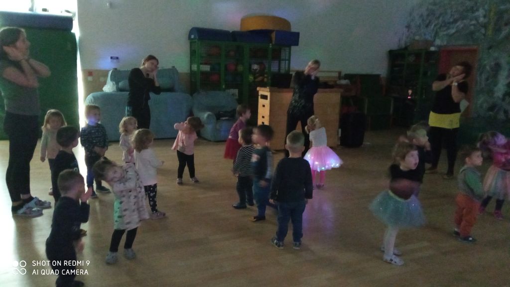 V petek, 7. 10. 2022, smo vzgojiteljice pripravile plesni »migi-migi« dan. V mali telovadnici šole so otroci ob predvajani projekciji in ob migetajočih pisanih lučkah zaplesali v ritmih otroške popularne glasbe ter se preizkusili v koreografijah skladb Just dance. Dekleta v frfotajočih krilcih in dečki v pisanih srajčkah in kavbojkah so razigrano zarajali ob spremstvu vzgojiteljic.