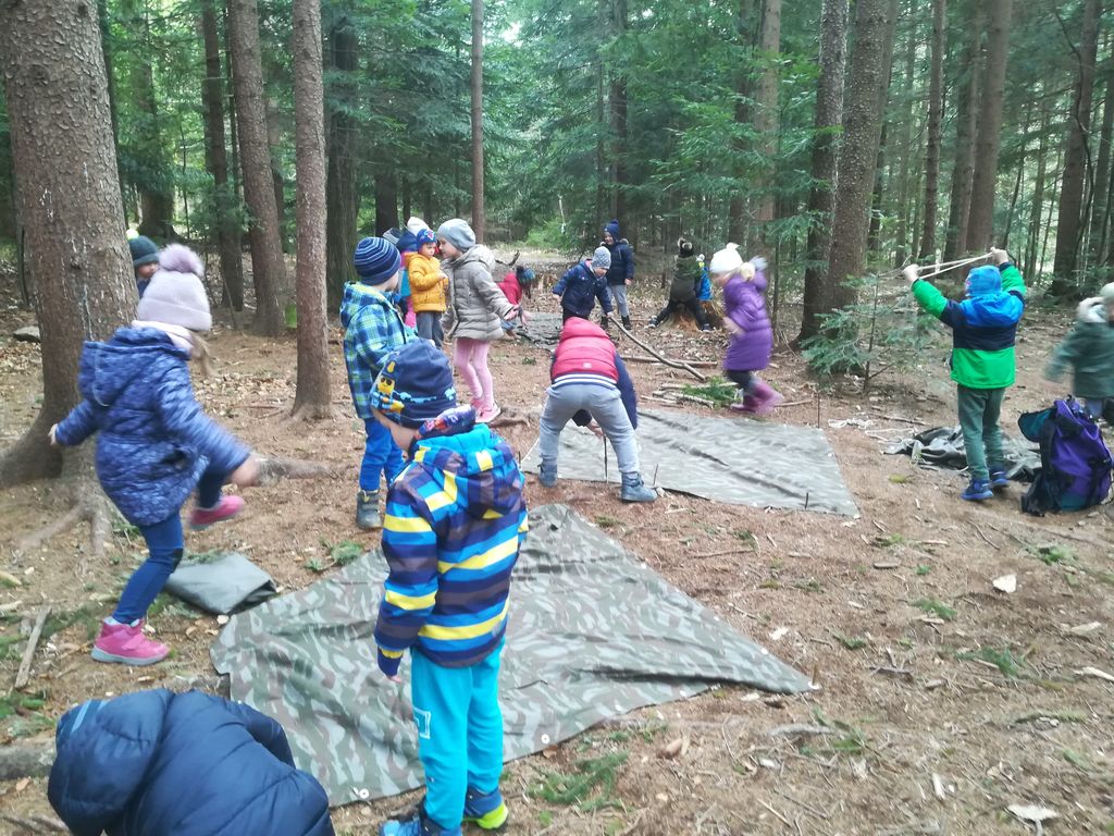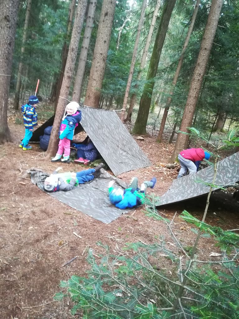Po kosilu smo se odpravili v bližnji gozd, kjer smo si z vodnikom in z nekaj dodatne opreme poskušali narediti bivake v naravi. Naloga ni bila enostavna: šotorska krila, vrvi – le kako si naj s tem pomagamo? Nato se nas je vodnik usmilil. Skupaj smo si naredili bivake v naravi, jim na tla dodali smrekove veje in si tako uredili mehko posteljo. Doživetje je bilo enkratno. Ob vrnitvi v dom nas je že čakala večerja, ki smo jo s slastjo pospravili v naše trebuščke. Ampak dneva še ni bilo konec. Malce smo še počakali, da je na pokrajino legla tema in že smo se, opremljeni z baterijskimi svetilkami, odpravili na sprehod po gozdu v trdi temi. Odkrili smo, da dom leži blizu avstrijske meje in smo se tako sprehodili ravno ob njej. Vrnili smo se zelo utrujeni. Po osvežilni prhi smo popadali v postelje in v trenutku zaspali.