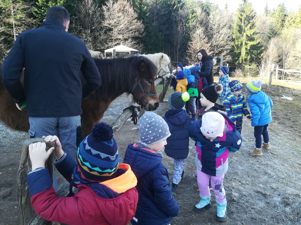 Naslednji dan, v torek, smo se zbudili v sončno jutro. Komaj smo čakali, da pozajtrkujemo, saj smo se nato odpravili na bližnjo kmetijo z malimi živalmi, kjer smo dan preživeli z islandskimi konji. Pomagali smo pri čiščenju, se o njih malce pogovorili, nato pa smo že jahali. Po dopoldanski malici smo se vrnili nazaj do kmetije, si ogledovali živali ter se o njih pogovarjali. Bližnji travnik pa nas je vabil, da smo še malo tekali in se »kopičakali« po bregu. Po kosilu smo v bližini doma igrali pastirčkove igrice. Igrali smo se igro s frnikolami, igro v šolo ter zbijanje veje. Bilo je zelo zanimivo. Po večerji smo si ob tabornem ognju še spekli sladico – twisterje. Seveda pa vrtca v naravi ni brez zabave v pižamah. Zato smo se po tuširanju preoblekli v pižame, se poveselili ob zvokih glasbe in se nato še bolj utrujeni ter pod vtisi doživetij odpravili k počitku.
