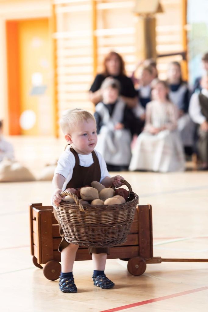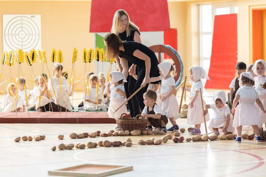 Predstavile so se vse skupine otrok Vrtca Cirkovce s skupnim ciljem – pospraviti poljske pridelke na način, kot so to počeli kmetje v starih časih. Najprej se je predstavila najstarejša skupina Kometi. Otroci so na oder priplesali v folklornih oblačilih ter prikazali ples in igro otrok nekoč. Nato so se predstavili najmlajši otroci iz skupine Lunice, ki so prikazali okopavanje njive z motikami in pospravljanje obilnega pridelka krompirja. Po opravljenem delu so se prijeli za roke in prešerno zaplesali ob pesmi Marko skače. Sledili so otroci iz skupine Zvezdice, ki so z njive pospravili pisane buče, jih trebili ter naredili bučno olje. V krogu so veselo zaplesali ob zvokih pesmi Mi se imamo radi. Otroci iz skupine Sončki so poželi in omlatili pšenico ter jo v velikih žakljih odnesli v mlin. Po delu so v parih živahno zaplesali ob pesmi Ob bistrem potoku. Sledil je nastop otrok iz skupine Mavrice, ki so pospravili in »skožuhali« koruzo ter v parih razigrano zaplesali ob pesmi Rom pom pom. Ker pa bo treba kmalu v šolo, so se na koncu prireditve predstavili mini maturanti iz skupine Kometi.