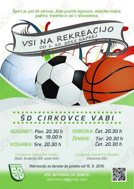 Pozdravljeni tako kot vsako letu tudi letos 1.10. začnemo z rekreacijo v dvorani. Ker nas sodoben način življenja in stres vse bol načenjata, smo ponovno poskrbeli, da se boste lahko vsak večer v tednu sproščali v dvorani v Cirkovcah. Rekreacijo smo zagotovila za vse starostne skupine. Potekajo pa naslednje dejavnosti.