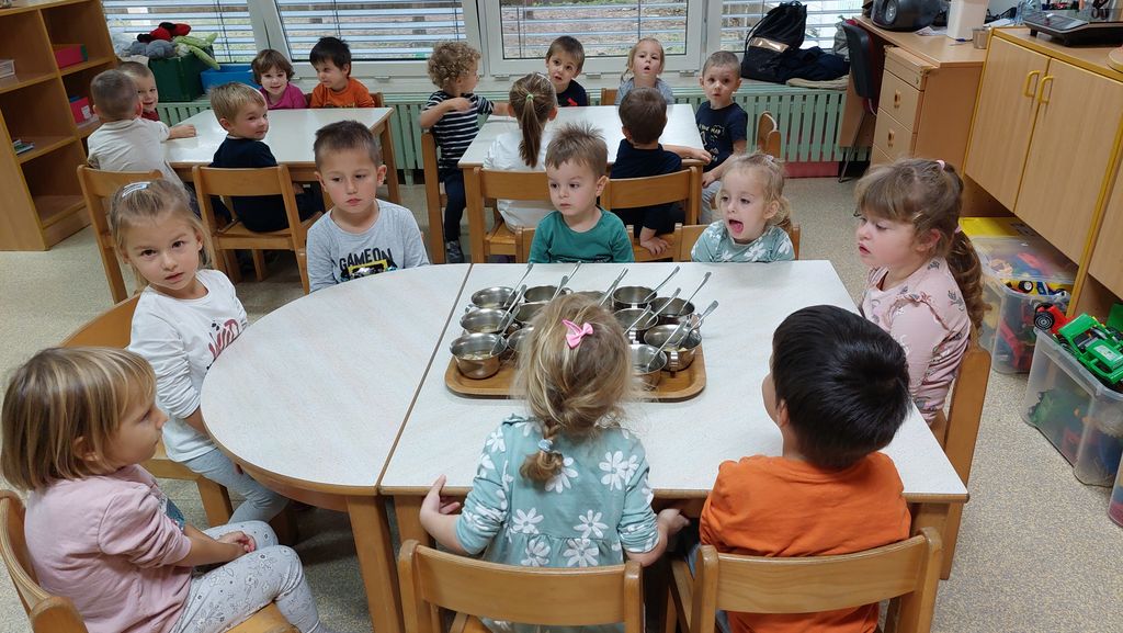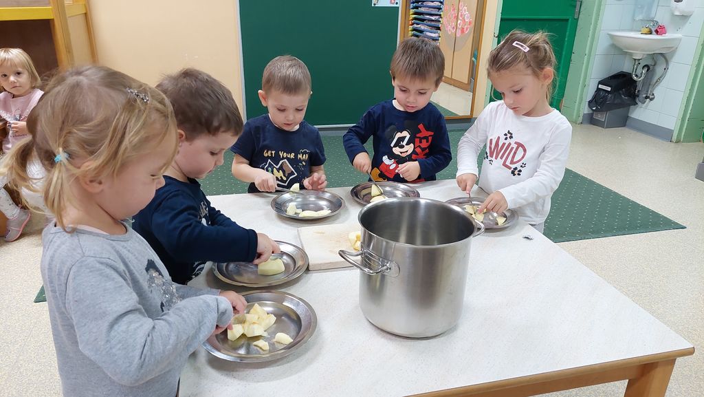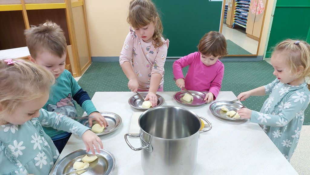 V torek, 24. oktobra 2023, ni dišalo samo iz kuhinje, ampak tudi iz igralnice skupine Sončki. Ker imamo poudarek na zdravi prehrani, sva se vzgojiteljici odločili, da skupaj z otroki pripravimo in skuhamo kompot.