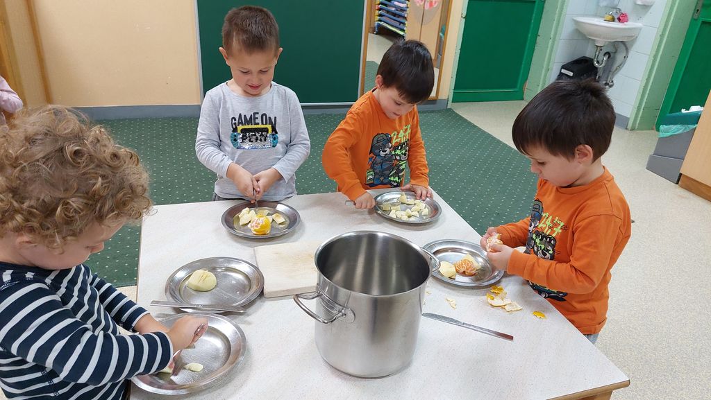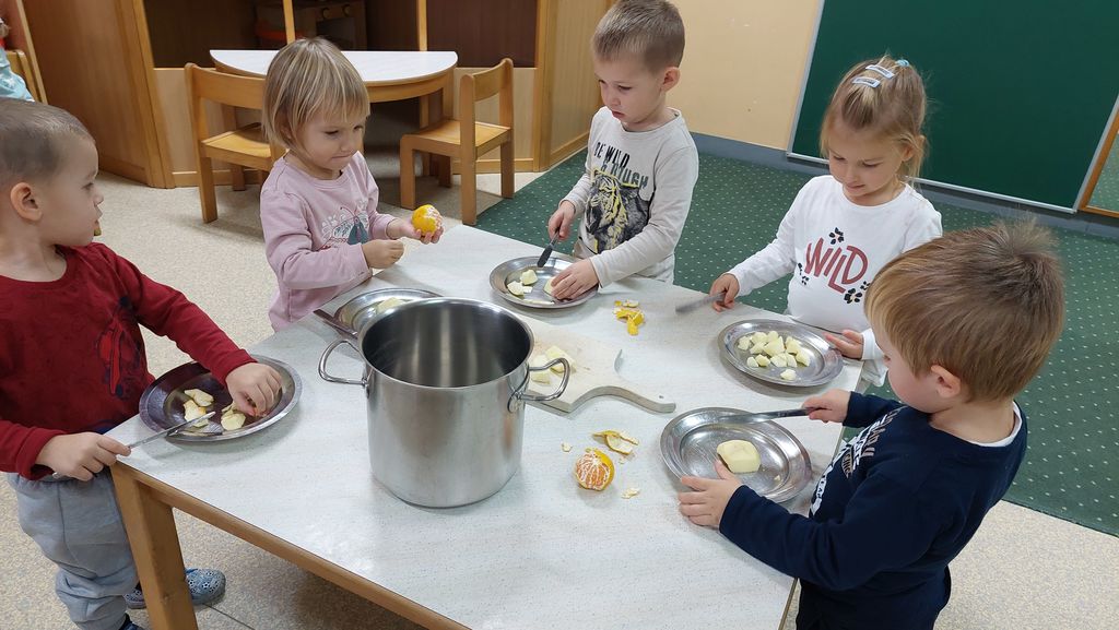 Najprej smo poimenovali kuhinjske pripomočke, nato sva vzgojiteljici olupili jabolka, otroci pa so jih narezali in olupili mandarine. Jabolka in mandarine smo stresli v posodo, dolili vodo, dodali malo sladkorja, cimeta in klinčkov in naš kompot je bil pripravljen za kuhanje.