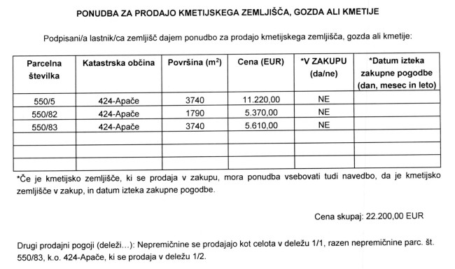Prodaja kmetijskih zemljišč v KO Apače - rok 2.7.2022