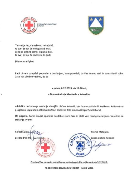Občina Kobarid in Rdeči križ - območno združenje Tolmin tudi letos vabita na tradicionalno prednovoletno srečanje starejših od 80 let, ki bo potekalo 6. decembra 2019 ob 16.30 v Domu Andreja Manfreda in na katerem se bo ob prigrizku obujalo spomine na dobre stare čase in pletlo vezi med generacijami. Kulturni program bodo pripravili učenci OŠ Kobarid. Podobnosti v priloženem vabilu.
