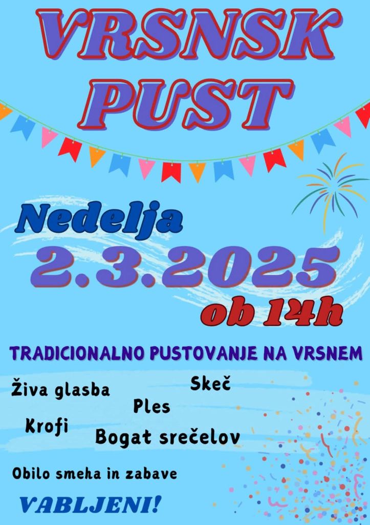 Lepo vabljeni na tradicionalno pustovanje na VRSNO, v nedeljo 2.3.2025 od 14h dalje.