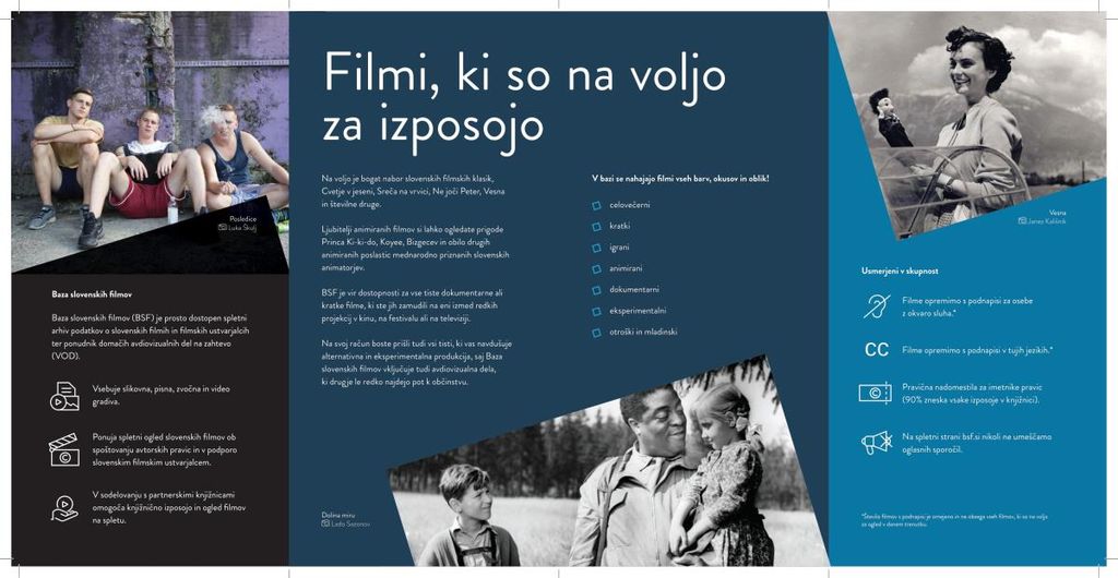 Knjižnica je v sodelovanju s Filmoteko članom knjižnice omogočila dostop do Baze slovenskih filmov. V Bazi so na voljo filmske klasike in sodobna filmska produkcija. Izbirate lahko med celovečerci, animiranimi, dokumentarnimi in kratkimi filmi kot tudi med eksperimentalnimi in alternativnimi avdiovizualnimi deli. Filmi so opremljeni s podatki o produkciji in ustvarjalcih. Na spletnem portalu so objavljene tudi novice in napovedi dogodkov iz sveta slovenske filmske produkcije.