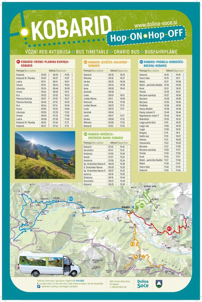 Hop ON Hop OFF KOBARID bo od 1. julija do 30. avgusta 2023 povezoval podeželje, oddaljene turistične točke, kopališča na Nadiži in izhodišča za pohodniške izlete s centrom Kobarida.