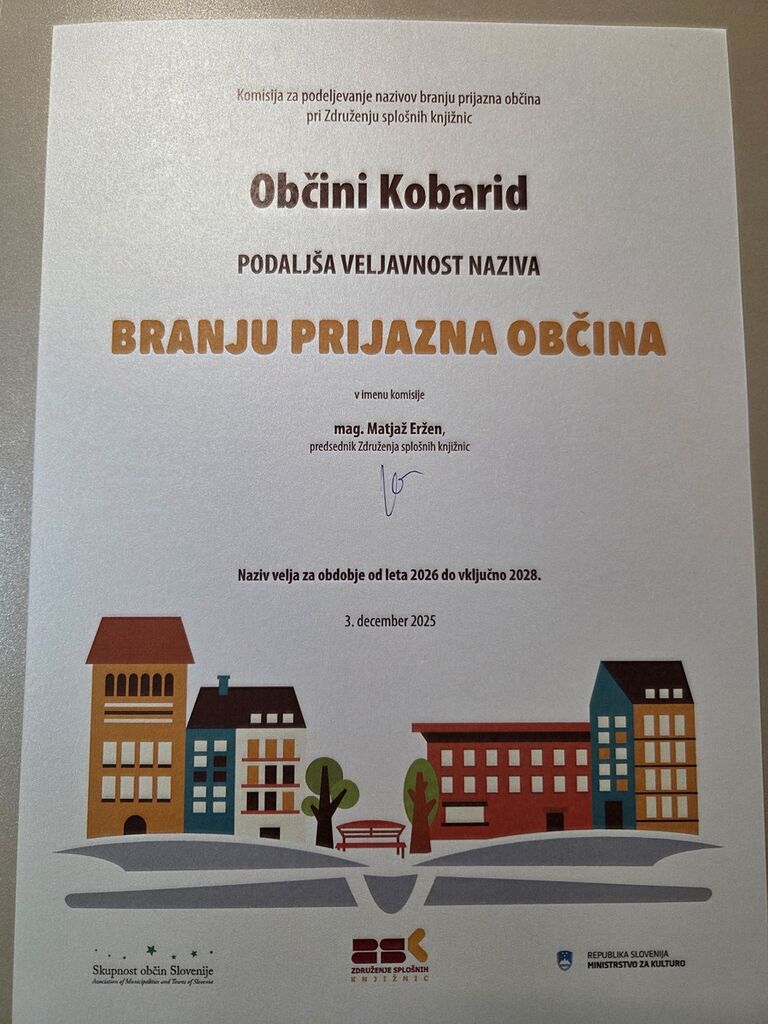 Zaradi raznolikih dejavnosti, medgeneracijskega povezovanja ter izjemnega prispevka k ohranjanju literarne in kulturne dediščine je Občina Kobarid pridobila podaljšan naziv Branju prijazna občina.