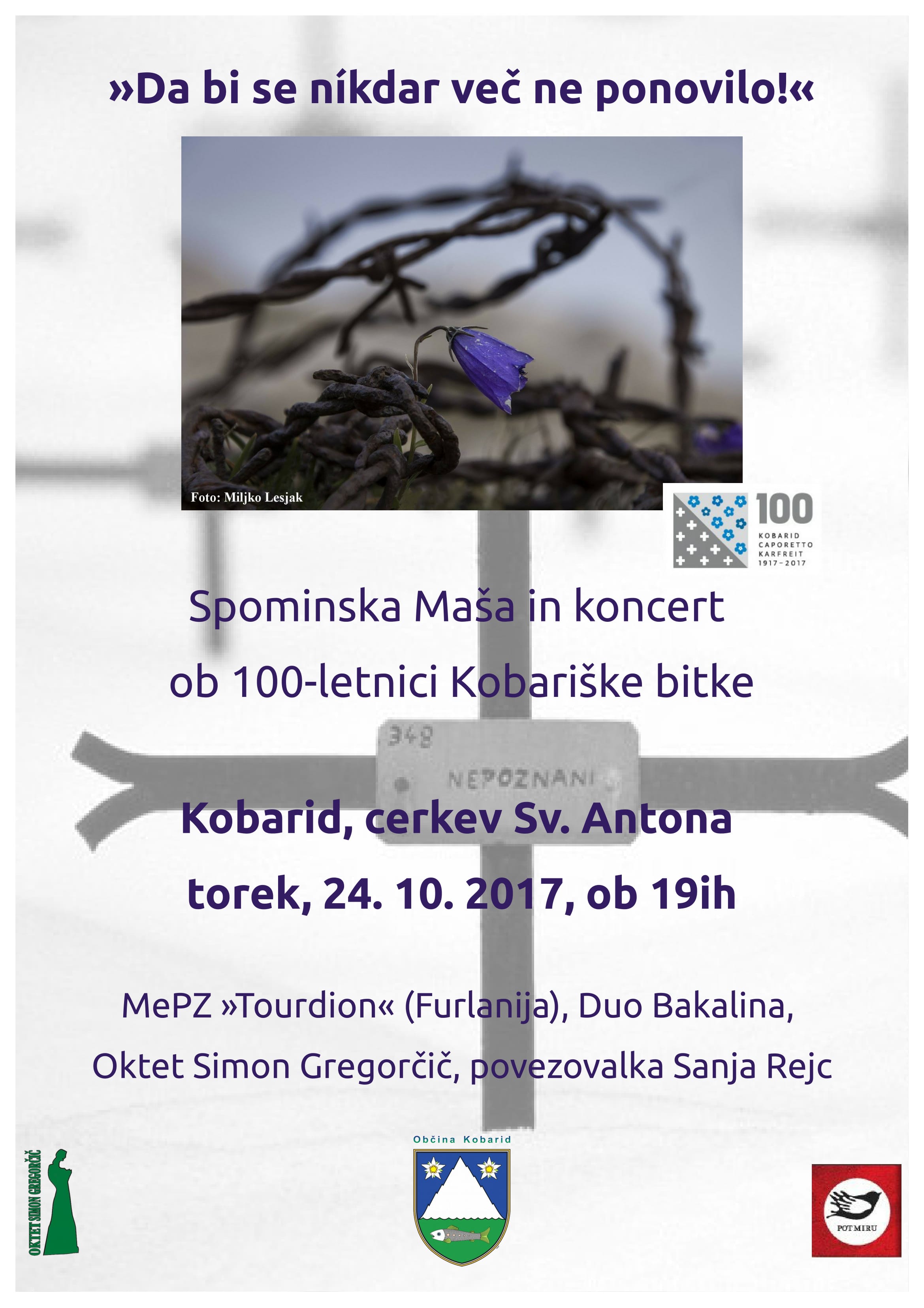 Ob 19:00 v cerkvi sv. Antona pri italijanski kostnici spominska maša in koncert Da bi se nikdar več ne ponovilo Okteta Simon Gregorčič Kobarid, Dua Bakalina ter mešanega zbora Tourdion Cavallico iz Italije.