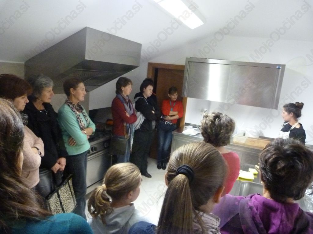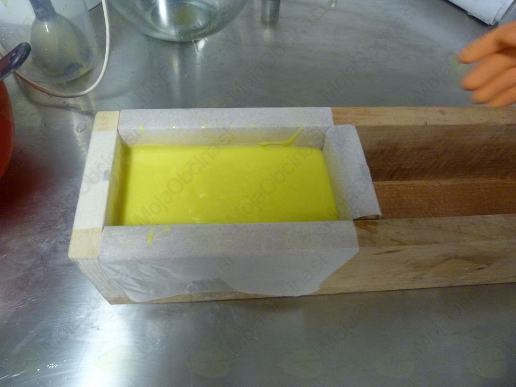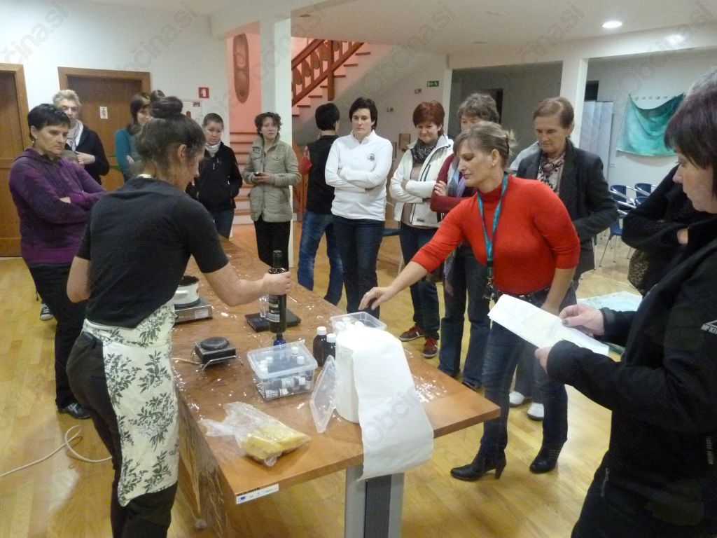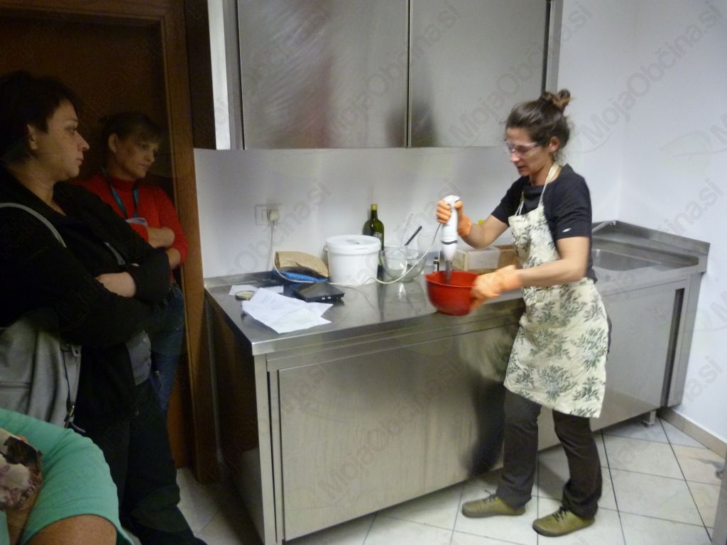 Gospa Mojca Kralj nam je v teoretičnem delu delavnice predstavila nekaj osnov izdelave mila in kreme, vendar smo se udeleženke bolj veselile prikaza praktičnega dela, kjer nam je prikazala pripravo naravnega mila po hladnem postopku, v katerem je uporabila oljčno olje, lug in destilirano vodo. Sama sicer večinoma uporablja kozje mleko namesto destilirane vode in tako še bolj pripomore k uporabi lokalnih sestavin ter izboljša kakovost mila.