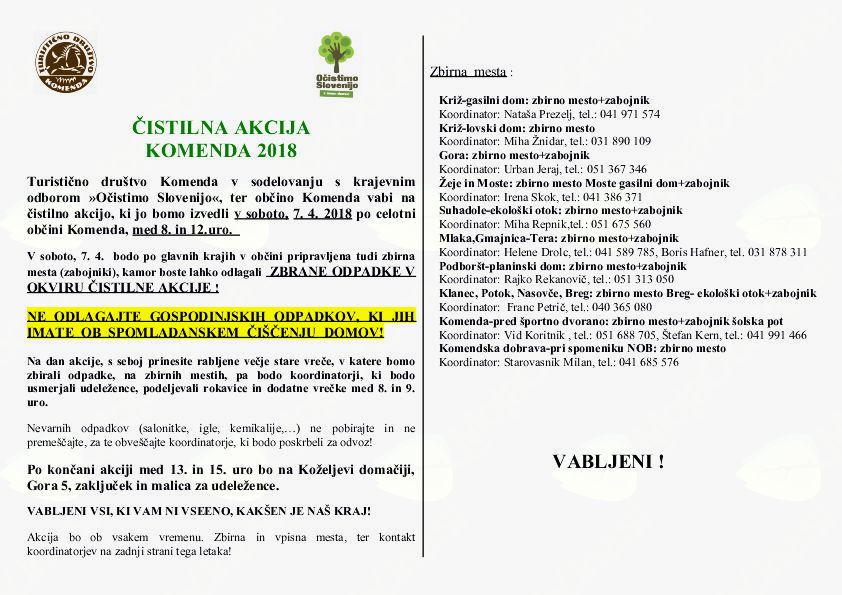 Turistično društvo Komenda v sodelovanju s krajevnim odborom »Očistimo Slovenijo«, ter občino Komenda vas v soboto 7.4.2018 vabi na čistilno akcijo